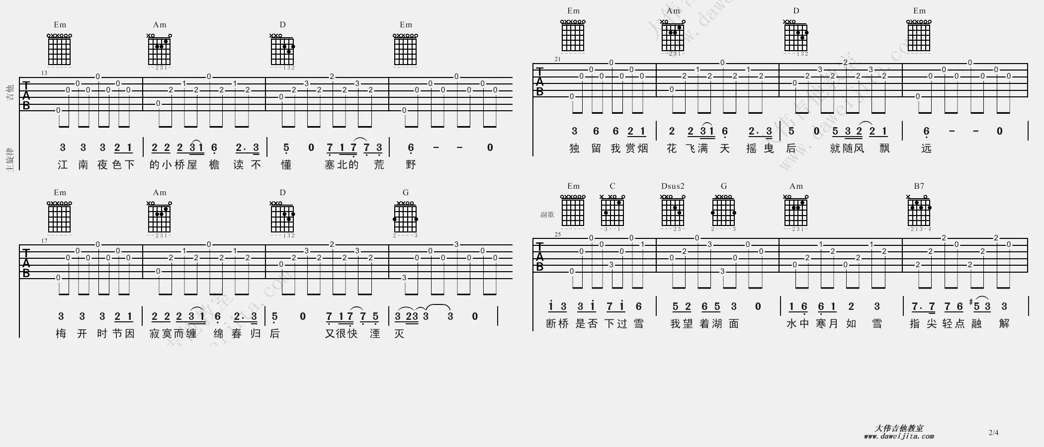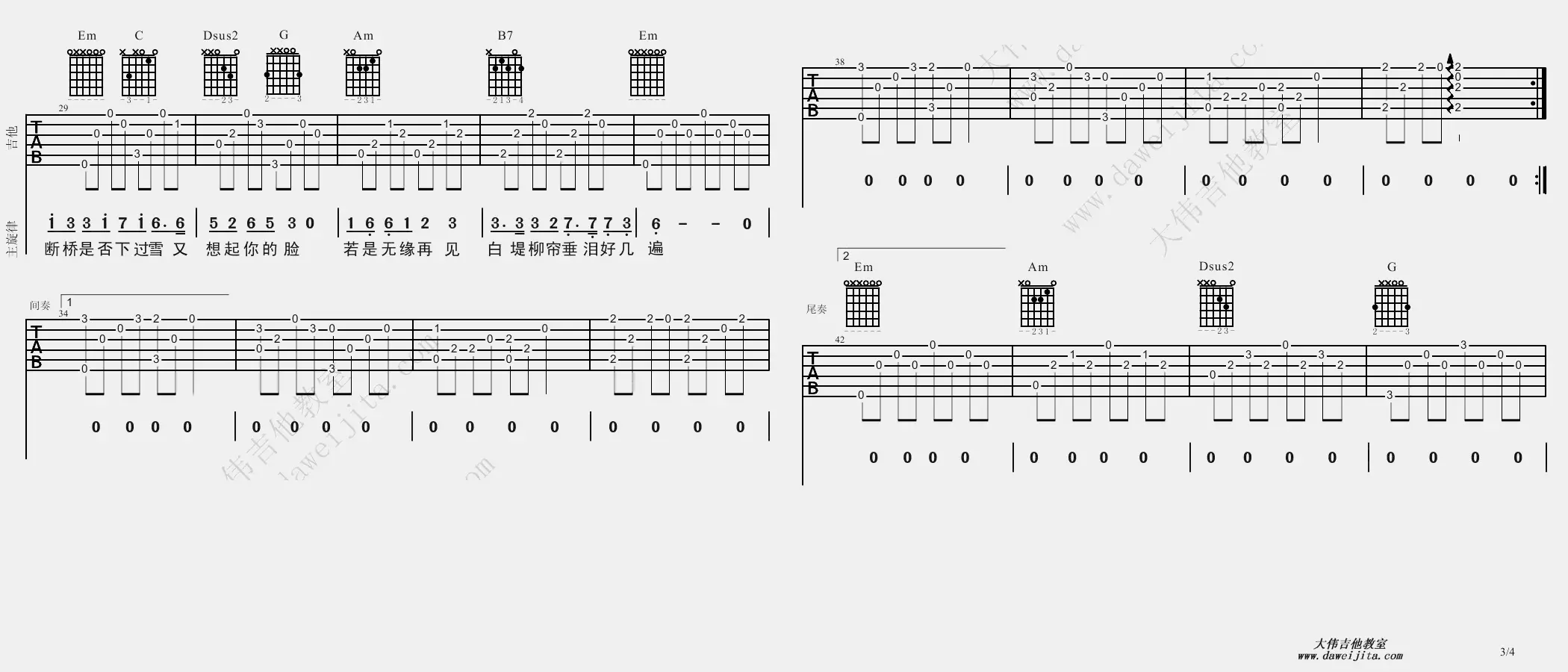 《断桥残雪》吉他谱,由许嵩作词、作曲并演唱,于2007年发行,收录在专辑《Vae新歌 + 精选珍藏合辑》 。这首歌是许嵩第一首被广为传唱的中国风歌曲,2013年许嵩带着新编曲版的《断桥残雪》登上央视元旦晚会,并在原有歌词基础上加了一句“若是有缘再见,断桥残雪沉默了语言”。吉他谱选用G调指法编配,共四张高清图片谱,由大伟吉他教室编配出品。