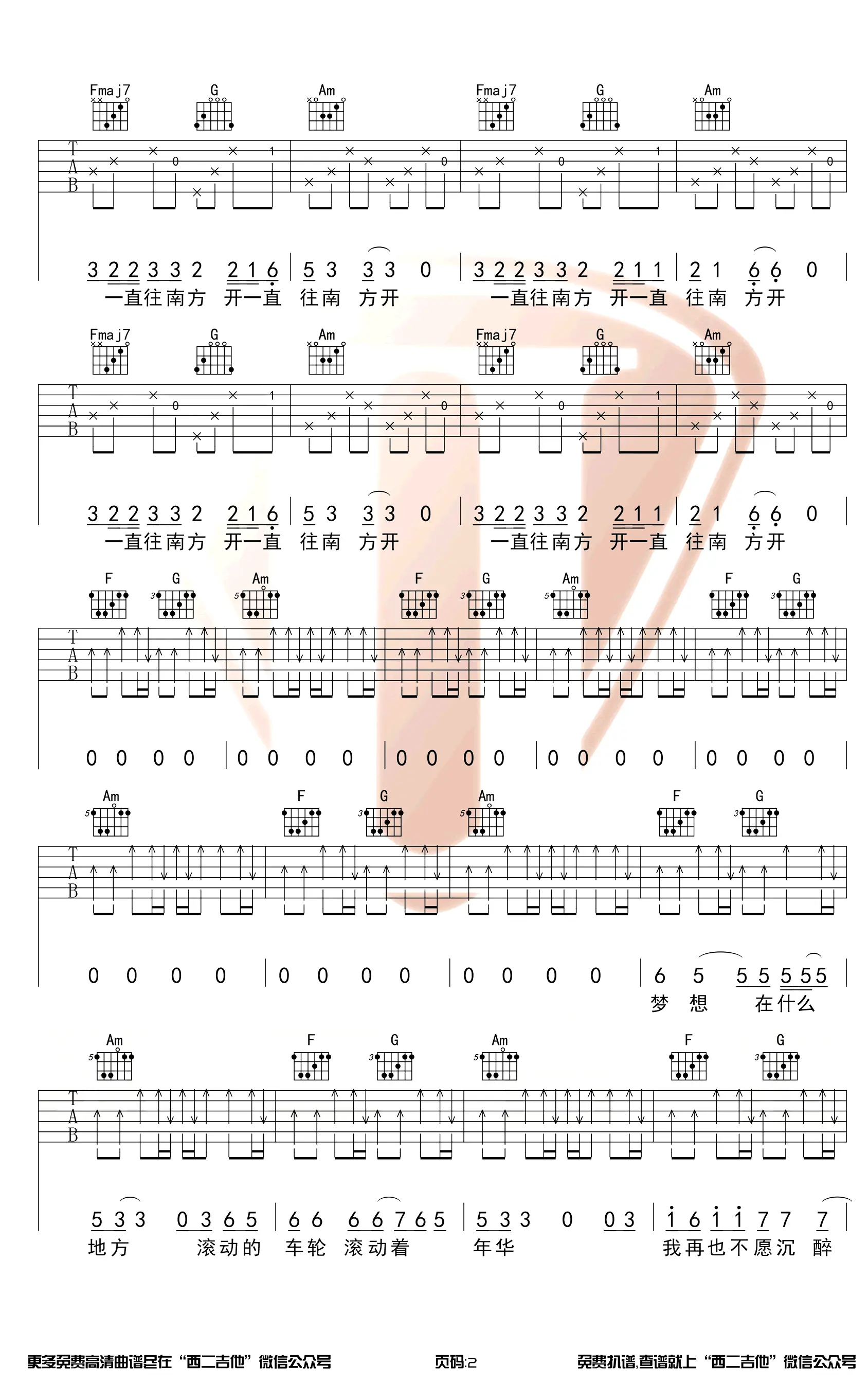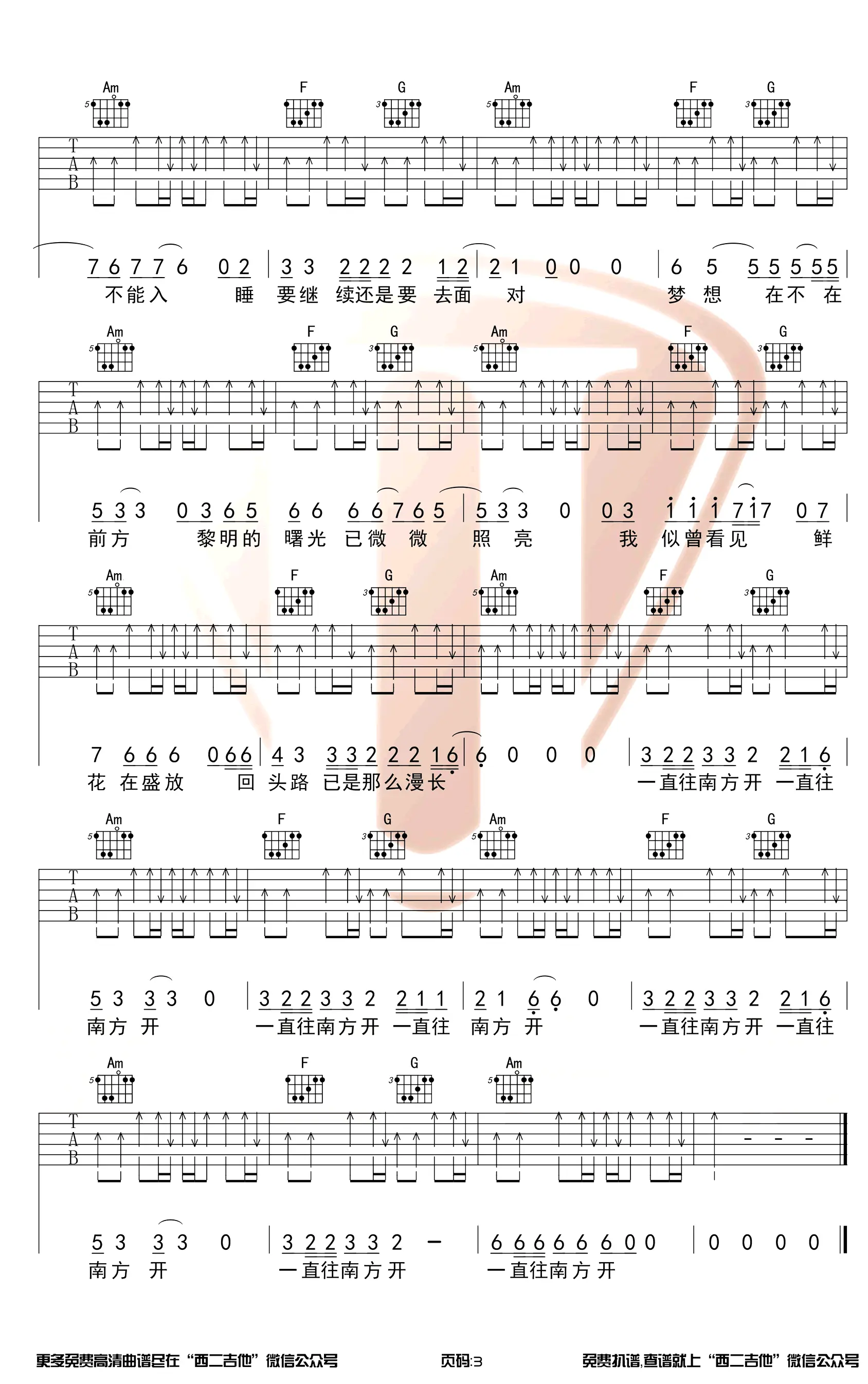 《公路之歌》吉他谱,由高虎作词、作曲,痛仰乐队演唱,于2008年9月30日发行,收录在专辑《不要停止我的音乐》中。此吉他谱为C调和弦原版编配,共3张图片谱,由西二吉他出品。整首歌仅三个和弦,却充满力量。歌词中“一直往南方开”反复吟唱,好似给人勇往直前的力量。