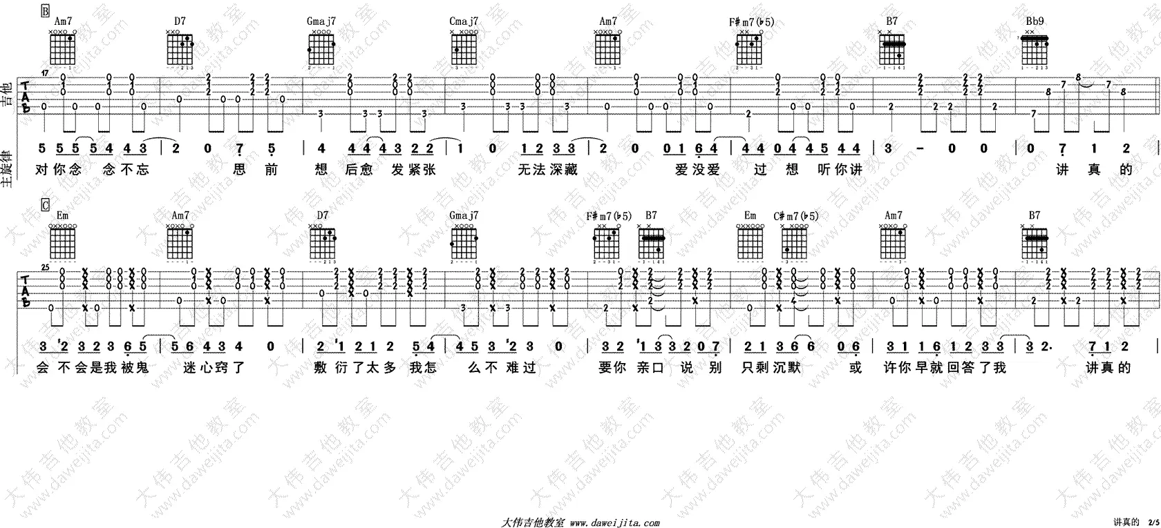 《讲真的》吉他谱,由黄然作词,何诗蒙作曲,最初是内地创作人李袁杰与曾惜联袂演唱的歌曲,于2018年5月21日发行,后摩登兄弟刘宇宁也曾翻唱该曲,并于2020年11月18日发行收录在专辑《讲真的》中。本曲谱为男声调编配,选用G调指法,变调夹夹第一品转Ab调,女声推荐变调夹夹四品。共五张图片谱,由大伟吉他编配出品。