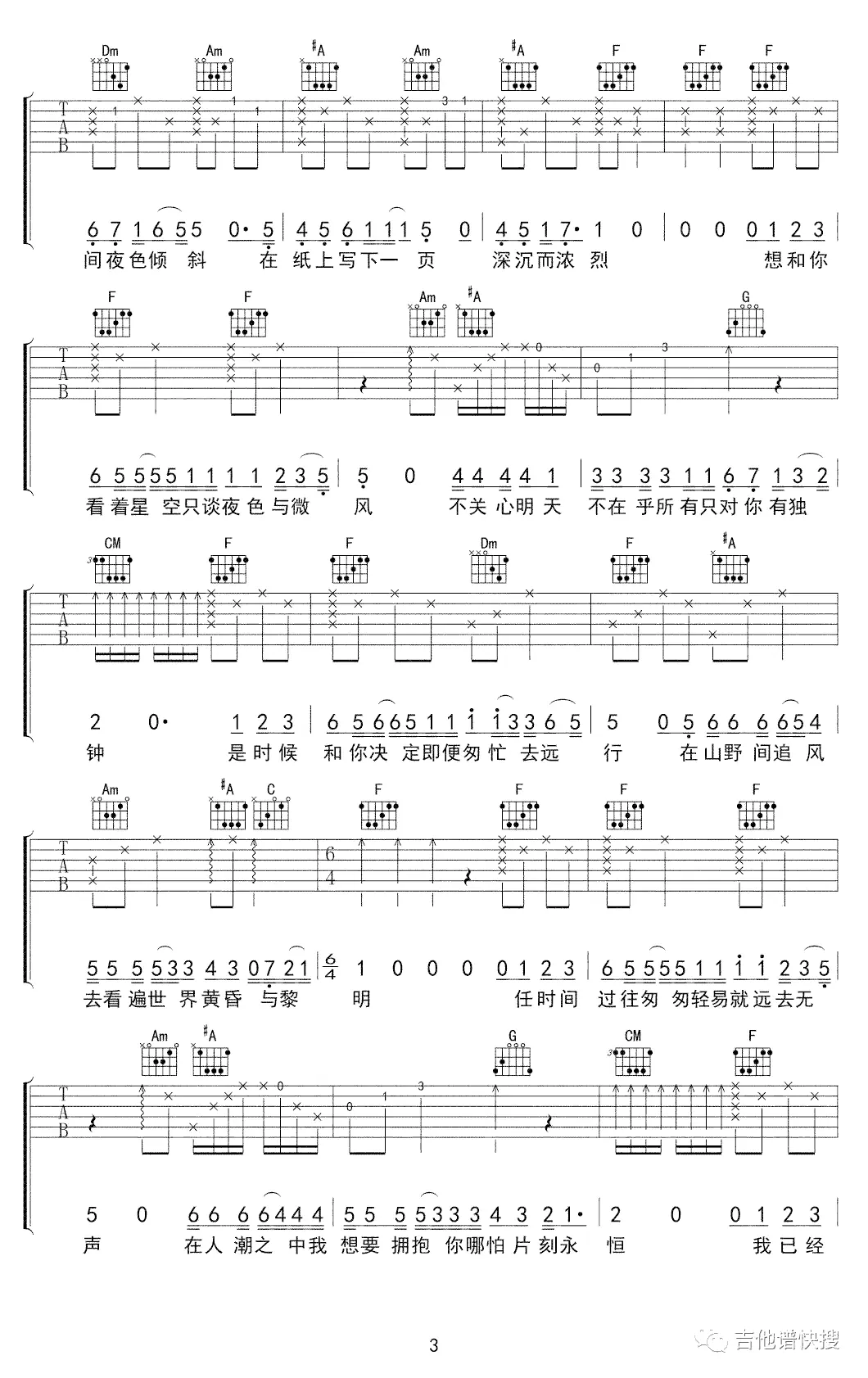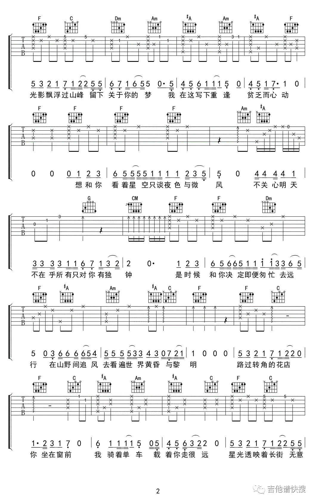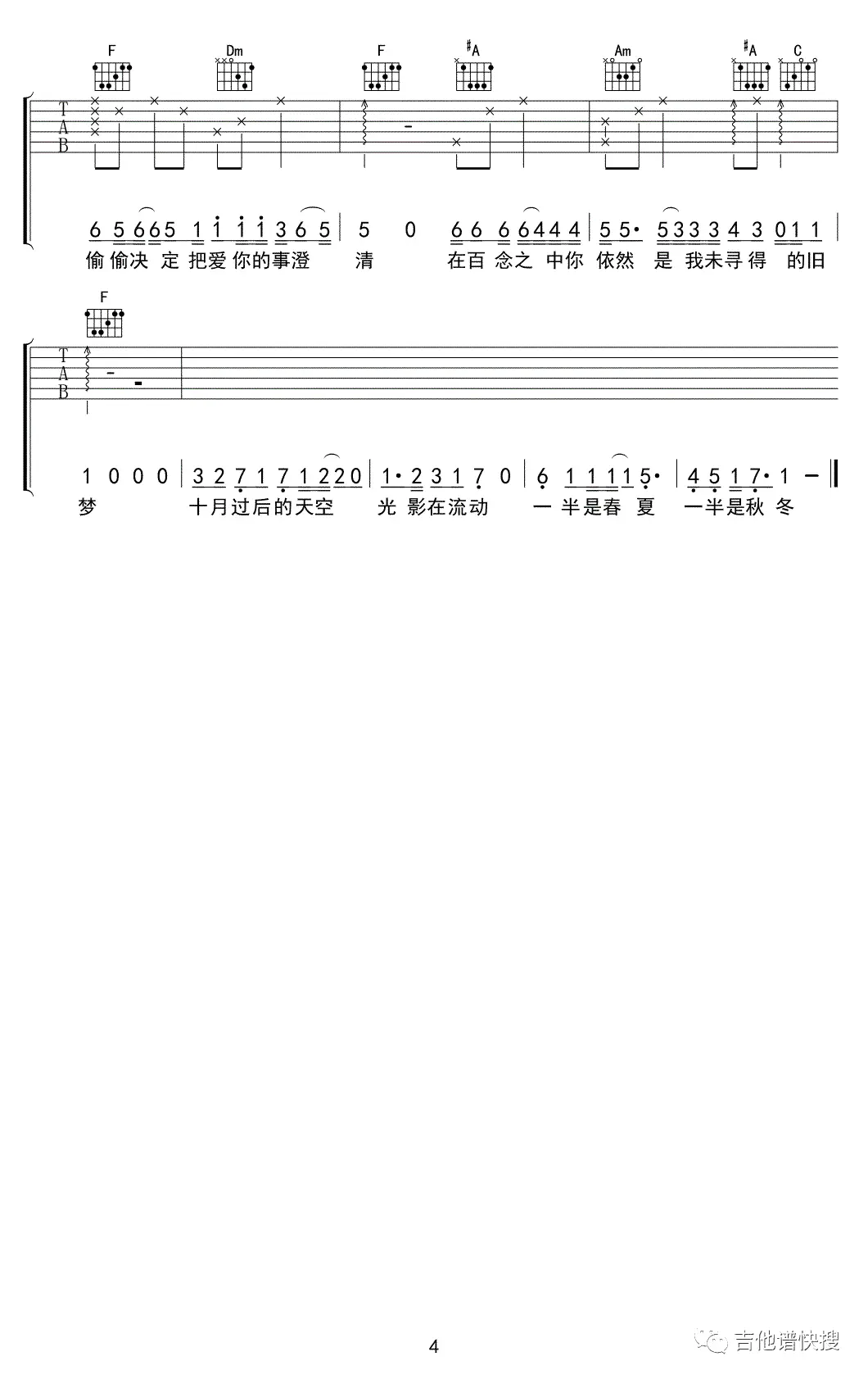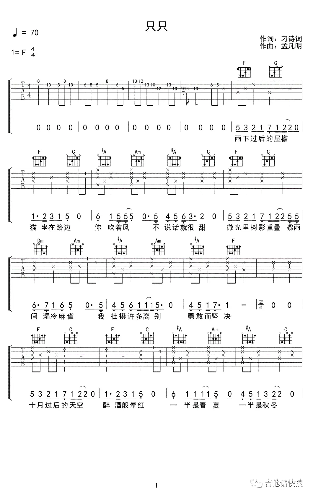 《只只》吉他谱_孟明凡_F调弹唱谱_六线图片谱