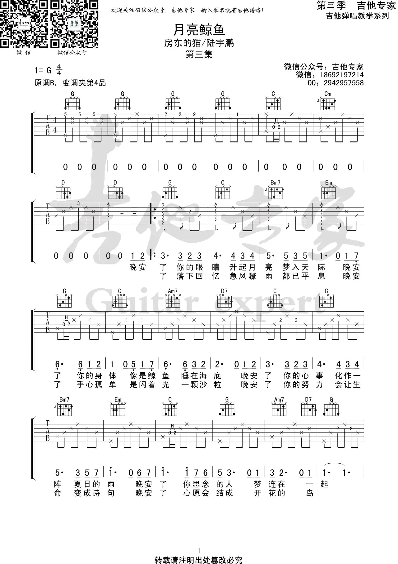 《月亮鲸鱼》吉他谱,由苟庆作词,方珲作曲,房东的猫和陆宇鹏演唱,于2020年发行,收录在同名专辑《月亮鲸鱼》中。此谱为G调指法编配,共2张图片谱,由吉他专家编配出品。