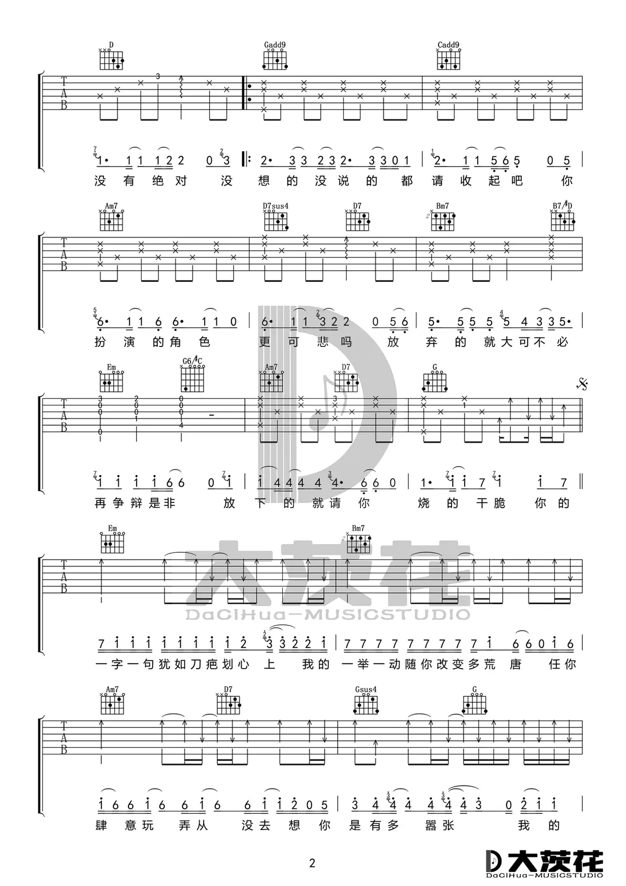 EN《嚣张》吉他谱,由李艺皓作词作曲,发行于2019,收录于同名专辑《嚣张》。歌曲原调B,吉他谱选调G,变调夹夹四品,共三张图片谱,由大茨花音乐工作室编配出品。