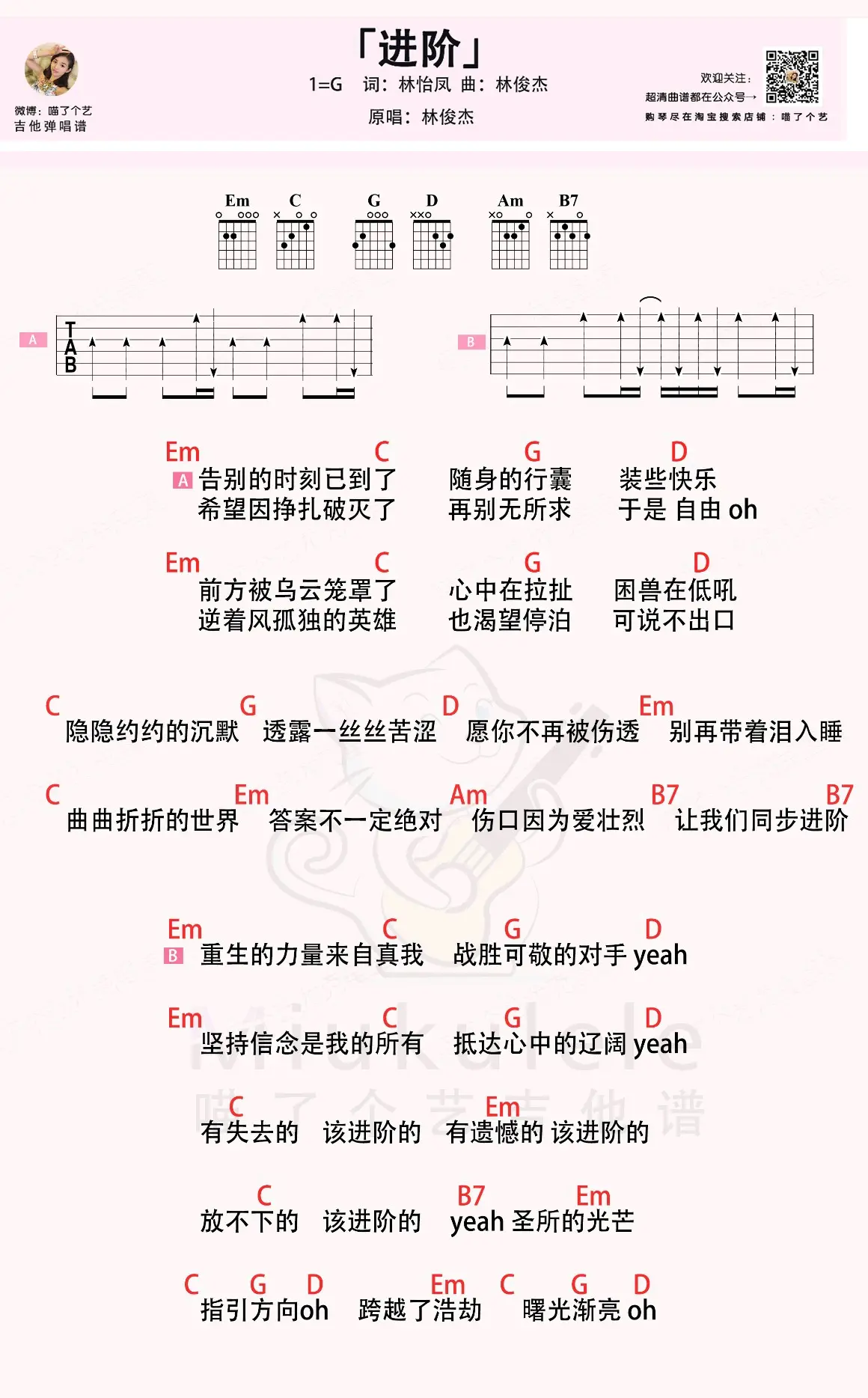 《进阶》吉他谱,林俊杰演唱的歌曲,由林怡凤作词、林俊杰作曲并演唱,2018年12月27日发行,同时也是"圣所2.0"世界巡演主题曲。吉他谱选用G调指法编配,共1张图片谱,喵了个艺制谱出品。