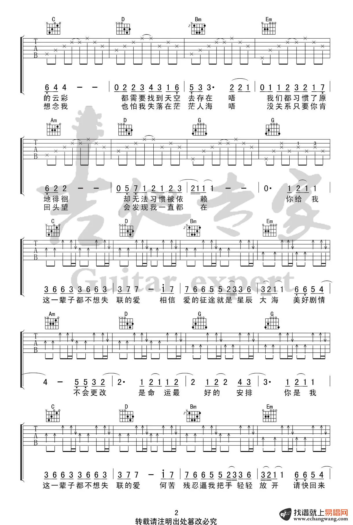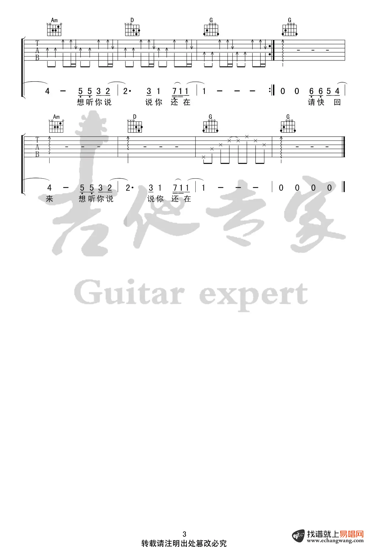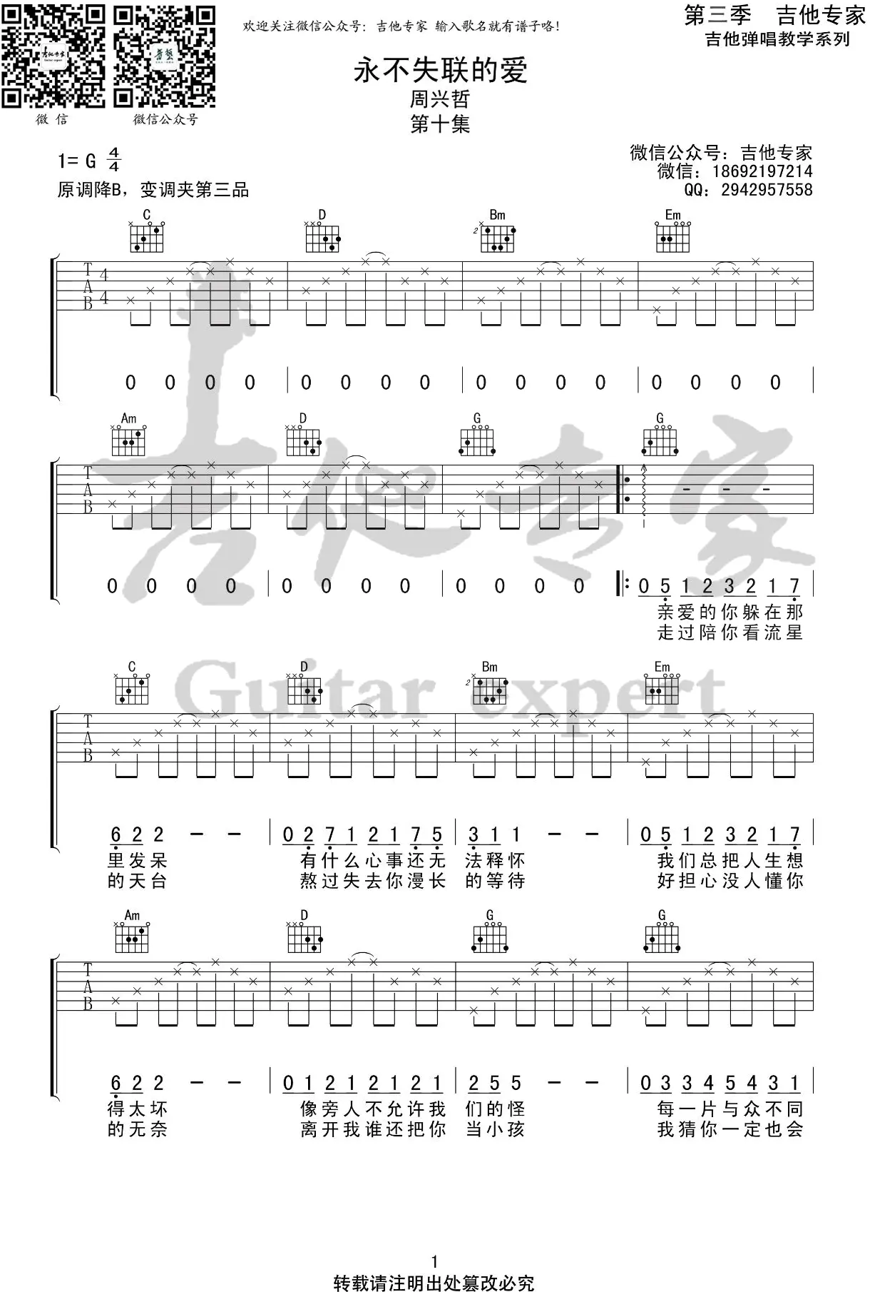 《永不失联的爱》吉他谱,周兴哲作曲并与饶雪漫合作词作的原唱版本收录于2017年专辑《如果雨之后》,单依纯的翻唱版于2020年正式发行。本谱采用G调简单版编配,3张图片谱,吉他专家编配出品。