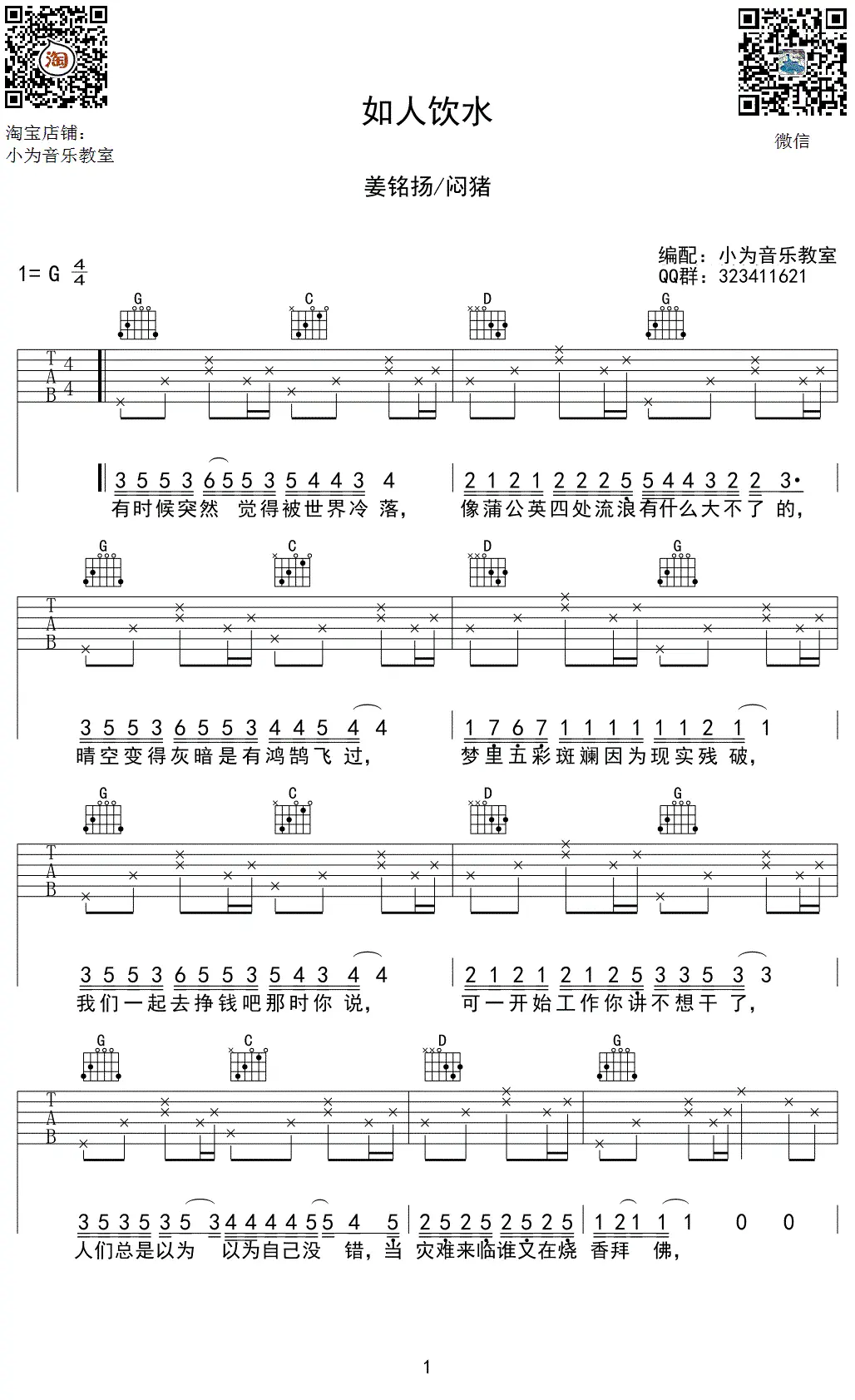 《如人饮水》吉他谱,姜铭扬、闷猪创作及演唱的一首温暖而略带忧伤的民谣歌曲,由姜铭扬作词作曲。吉他谱选用G调指法编配,共3张高清图片谱,由小为音乐教室编配出品。