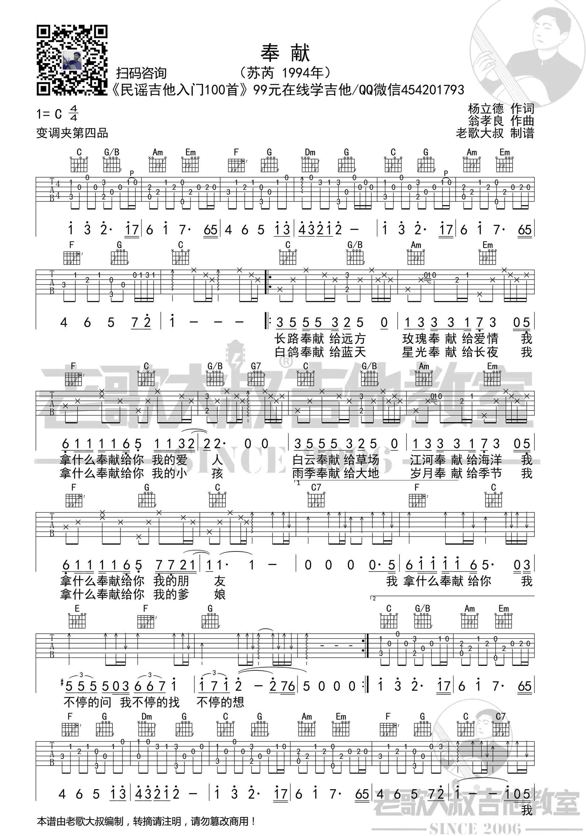 《奉献》吉他谱,苏芮原唱的一首经典老歌,韩寒在电影《飞驰人生》中重新演绎作为片尾曲,由杨立德作词,翁孝良作曲,收录于1988年发行的专辑《台北·东京》中。吉他谱选调C调,共3张高清图片谱,由老歌大叔制谱出品。
