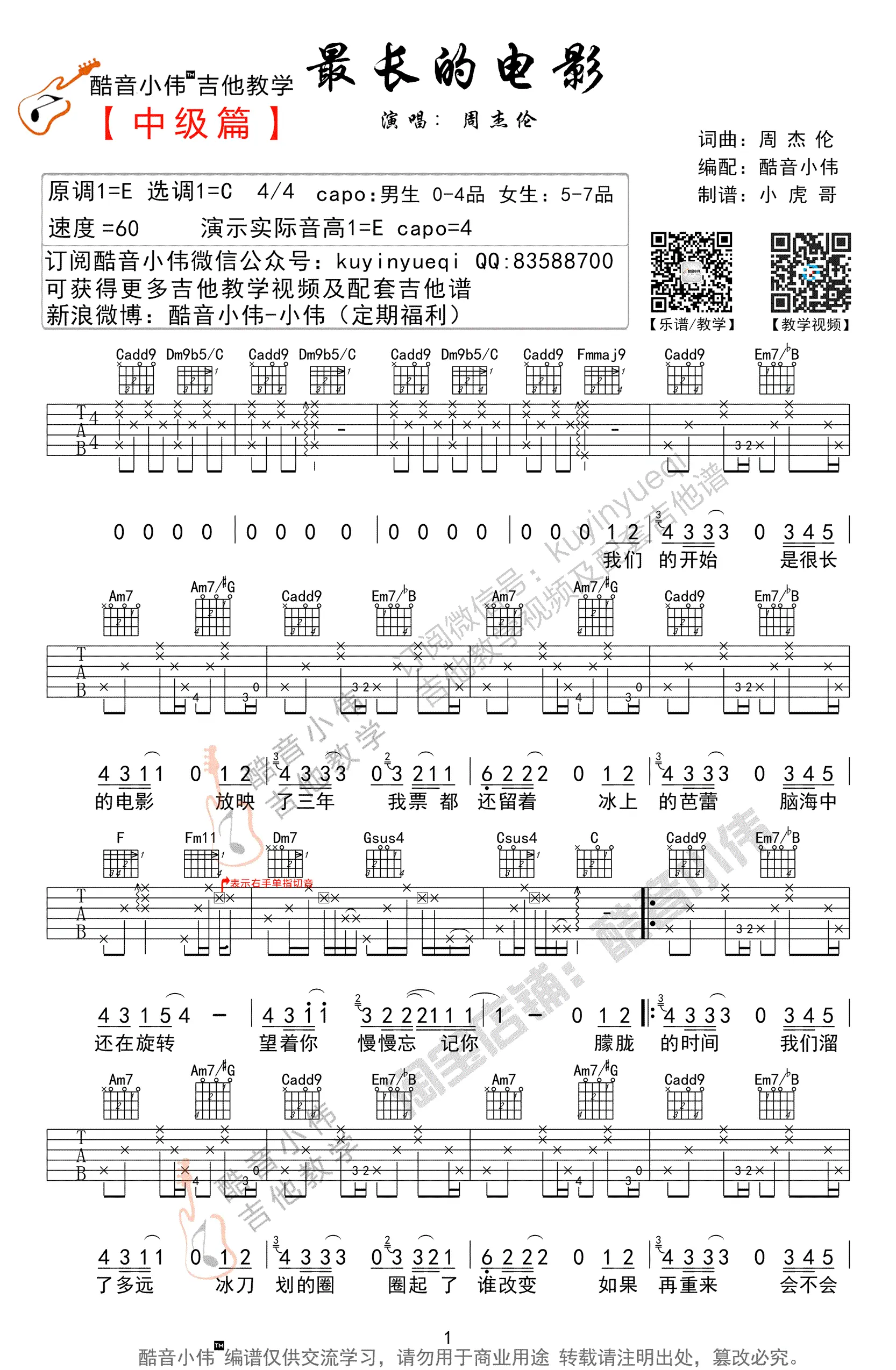 最长的电影吉他谱,周杰伦创作并演唱的一首经典歌曲,由周杰伦作词作曲,收录于2007年发行的专辑《我很忙》中。歌曲原调E,吉他谱选用C调指法编配,共3张图片谱,由酷音小伟制谱出品。
