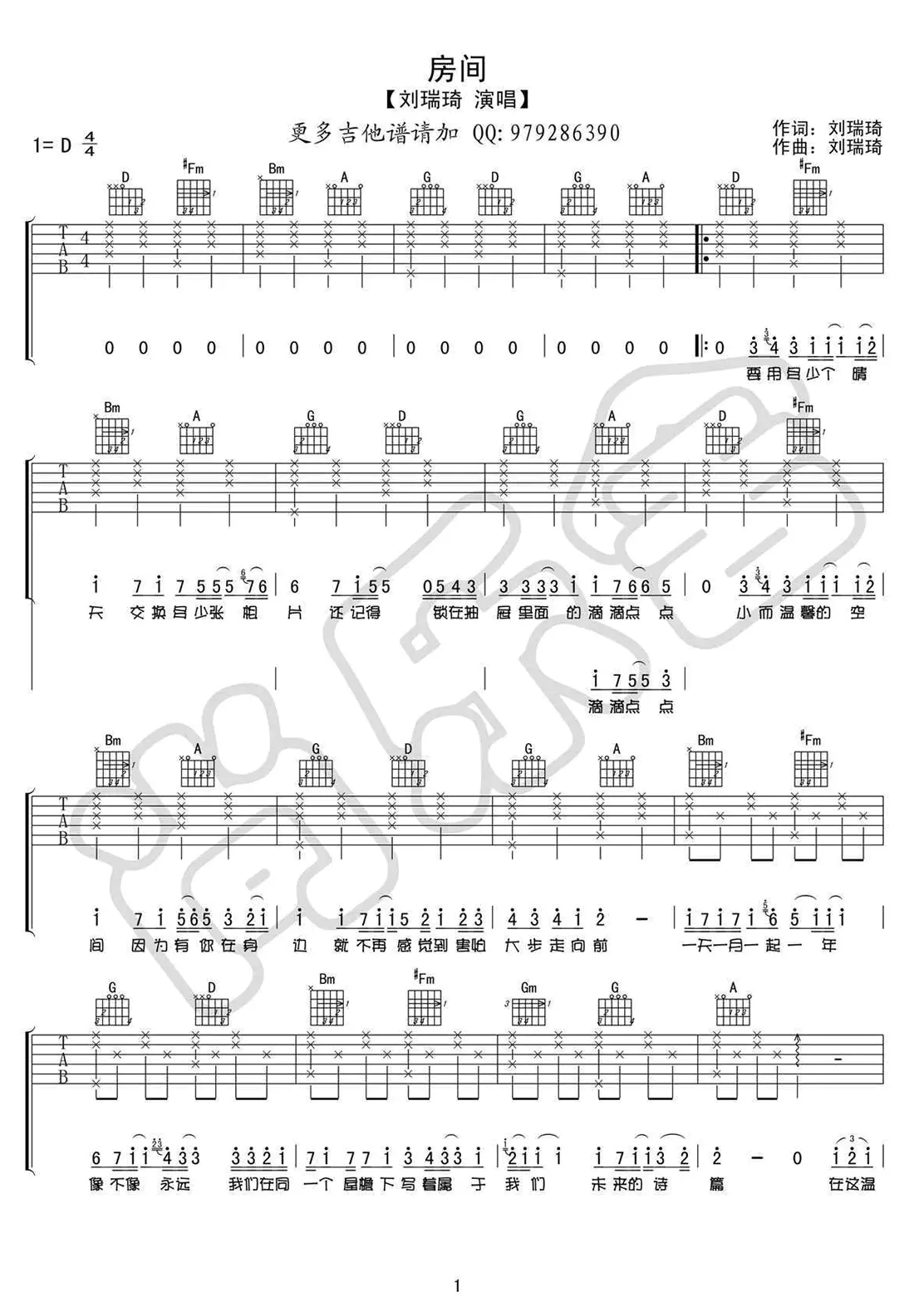《房间》吉他谱_刘瑞琦_D调指法_扫弦弹唱谱_图片六线谱