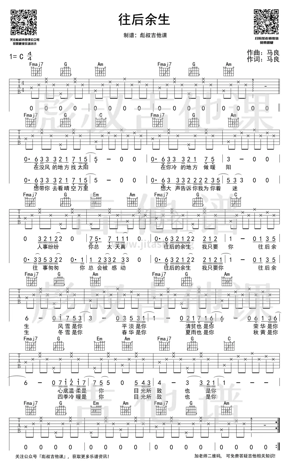 《往后余生》吉他谱_马良_C调_高清弹唱六线谱_图片谱