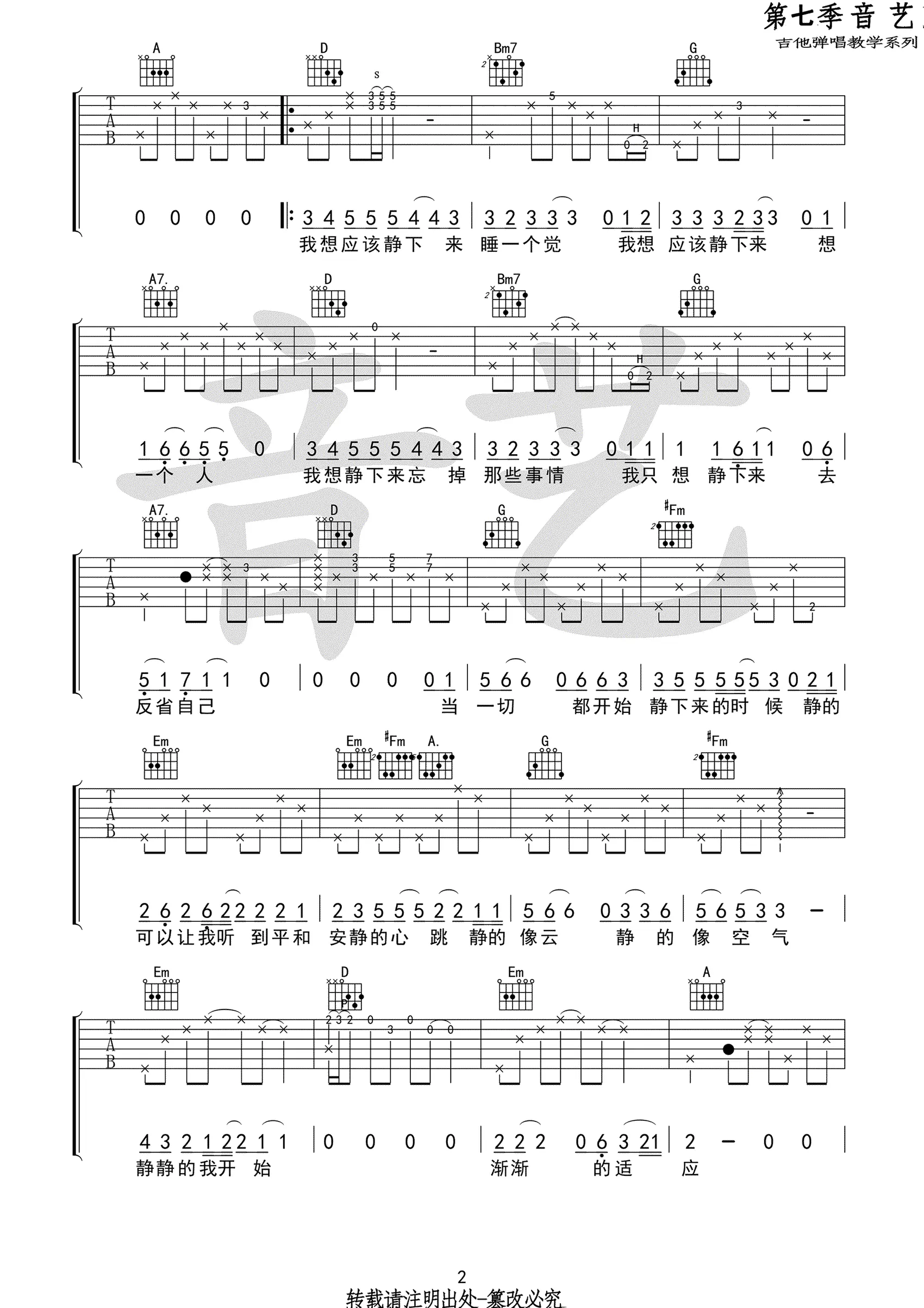 《静下来》吉他谱,赵雷作词作曲,大乔小乔演唱,2012年发行,收录于专辑《渔樵问答》中,沉静治愈曲风。吉他谱选用D调指法编配,高清弹唱六线谱,由艺音编配出品。