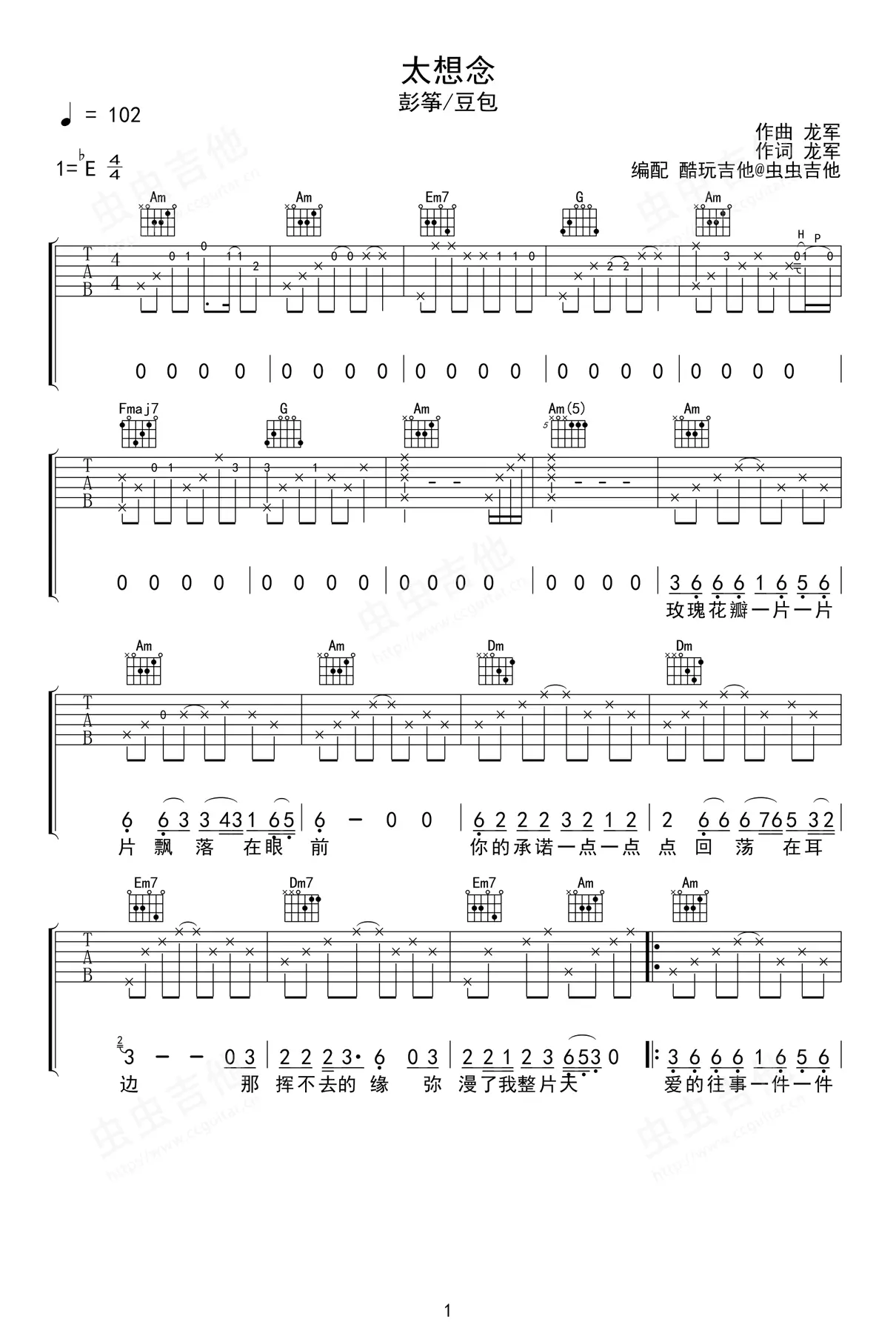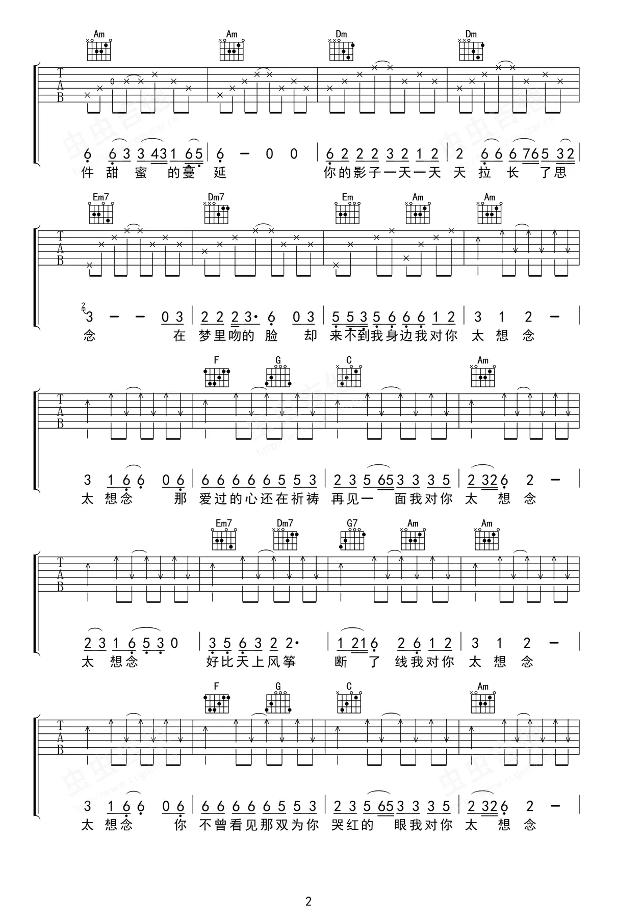 《太想念》吉他谱_彭筝/豆包_弹唱谱_六线谱_图片谱