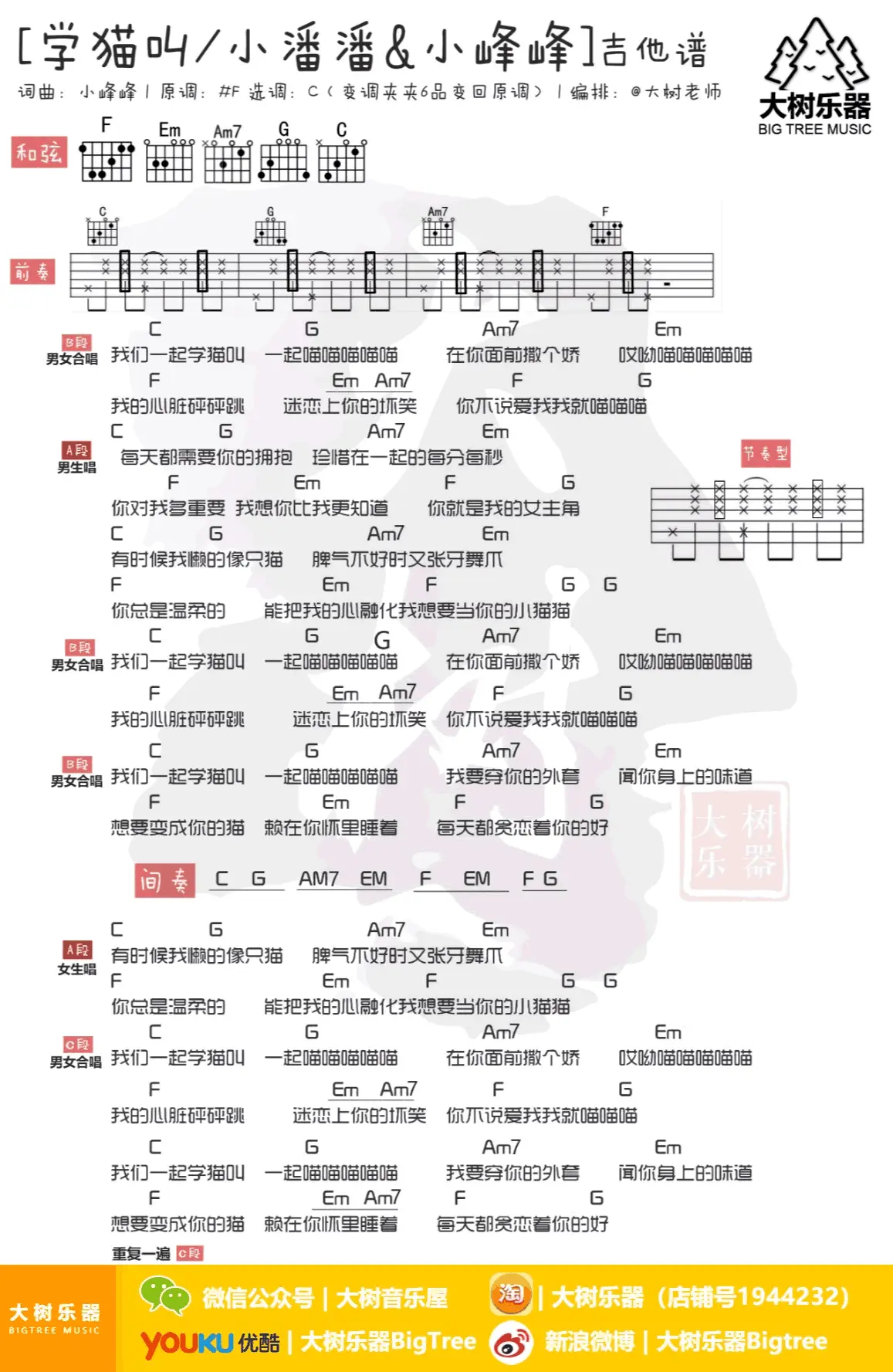 《学猫叫》吉他谱 C调弹唱谱,小潘潘和小峰峰合唱的一首热门网络歌曲,由小峰峰作词作曲,2018年发行。歌曲原调#F,吉他谱选用C调指法编配,capo夹6品为原调,由大树乐器编配出品。