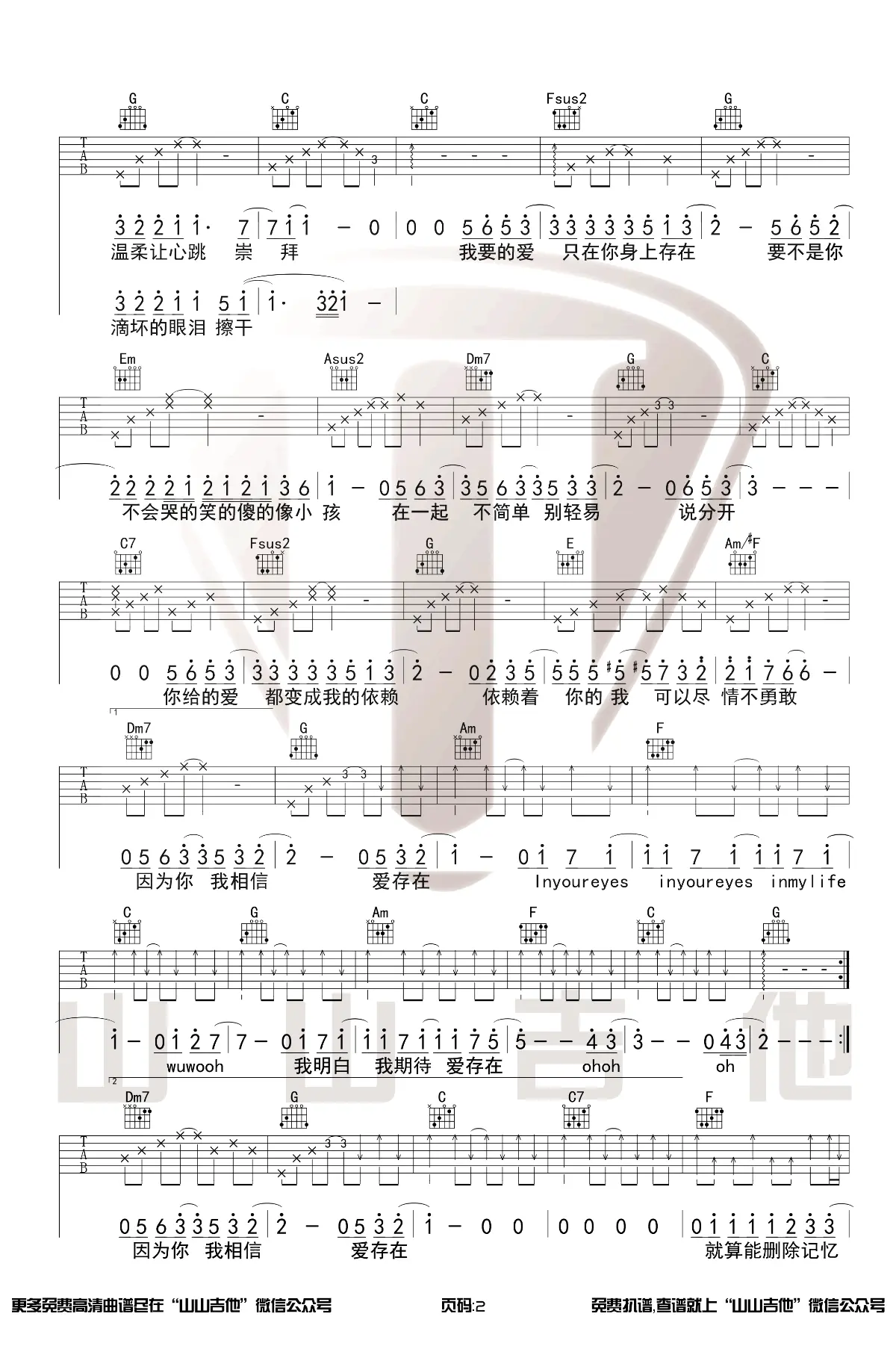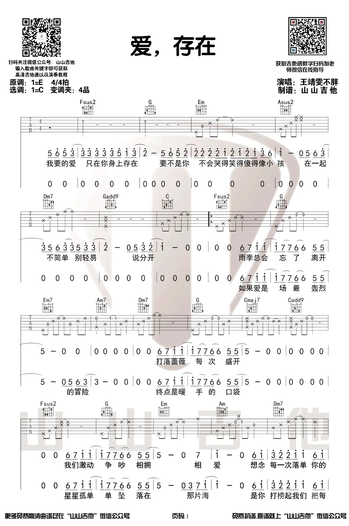 《爱存在》吉他谱,原唱魏奇奇,王靖雯不胖翻唱,由吴易纬作词,蔡明仁作曲,收录于2020年发行的单曲《爱,存在 - Single》中,这首歌是电影《流星花园》的插曲。 吉他谱选用C调指法编配,capo夹4品,演奏难度适中,由山山吉他编配出品。