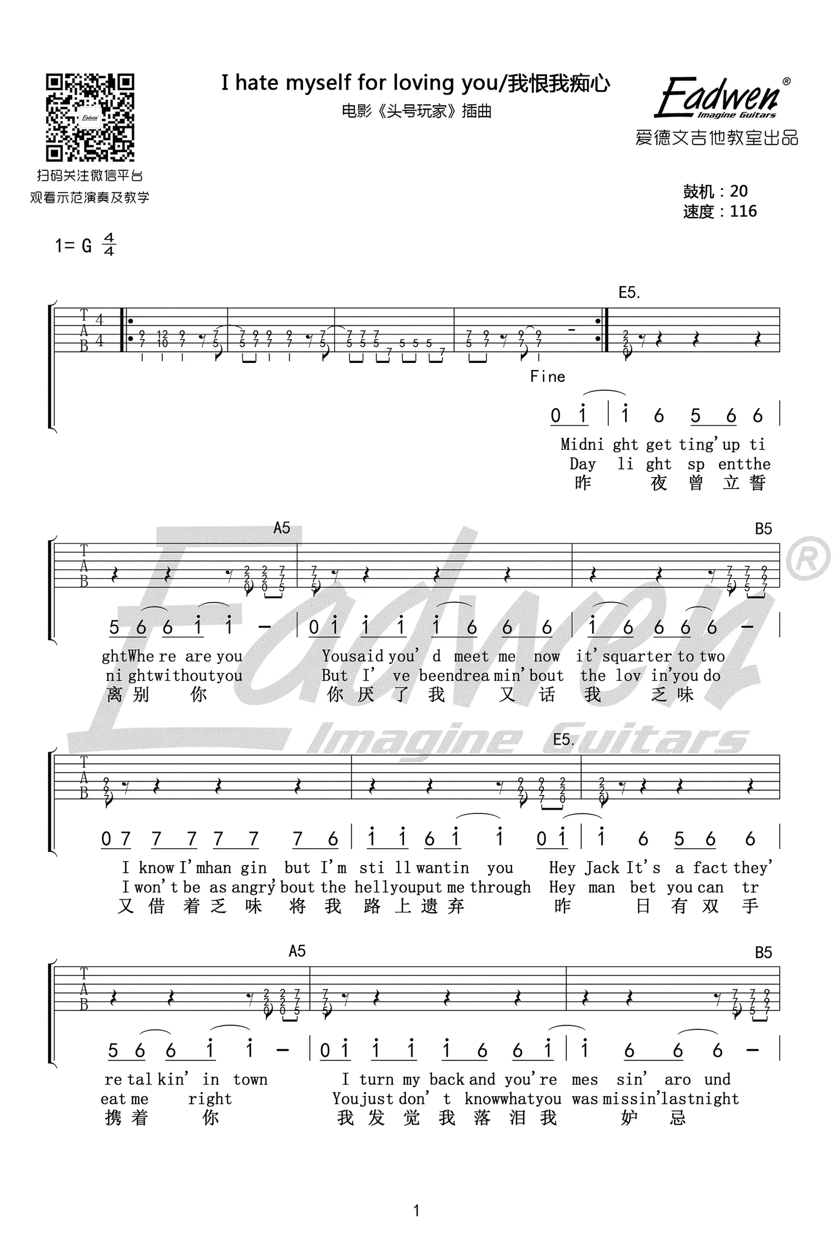 《I Hate Myself For Loving You》吉他谱,美国摇滚女歌手Joan Jett演唱,Joan Jett、Desmond Child作词作曲,1988年发行,收录于专辑《Up Your Alley》中,这首歌是电影《头号玩家》的插曲。吉他谱选用G调指法编配,共3张高清图片谱,由爱德文吉他教室编配出品。