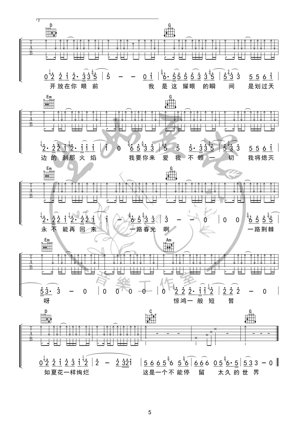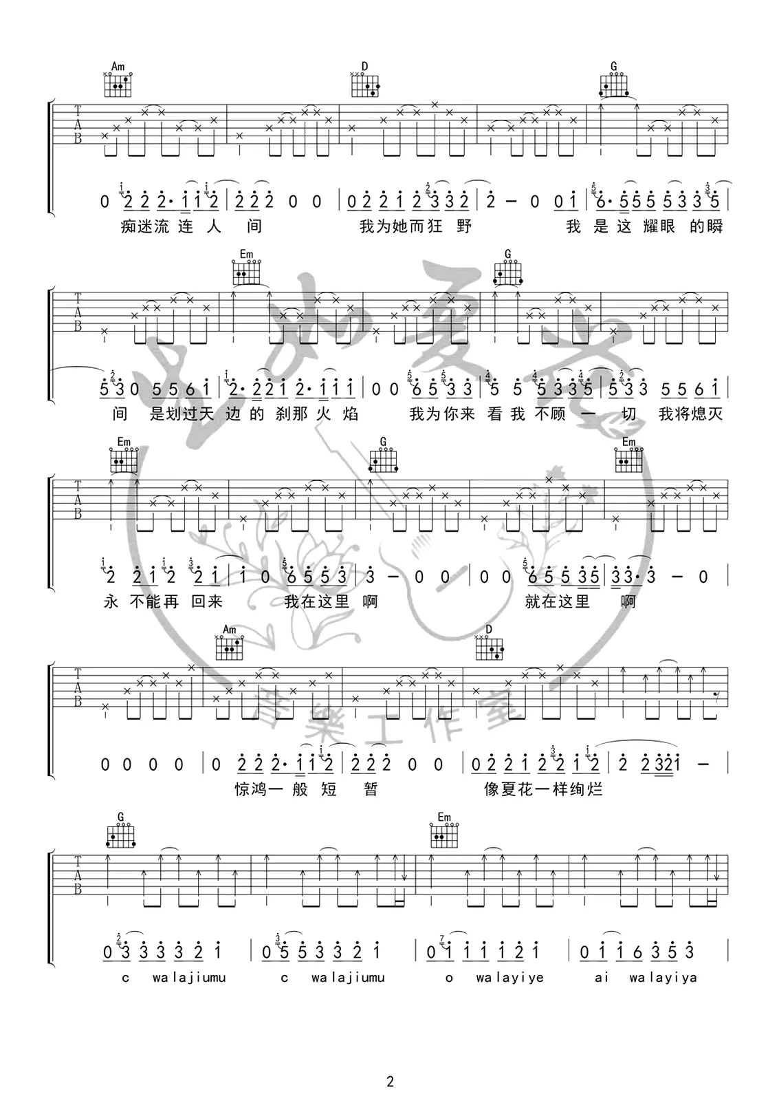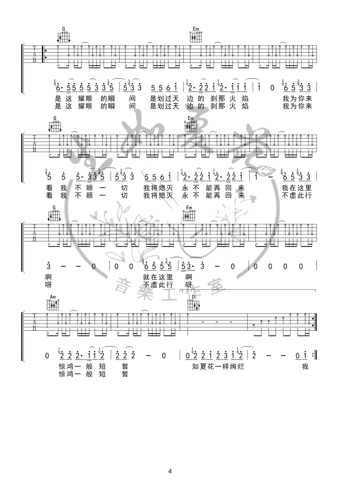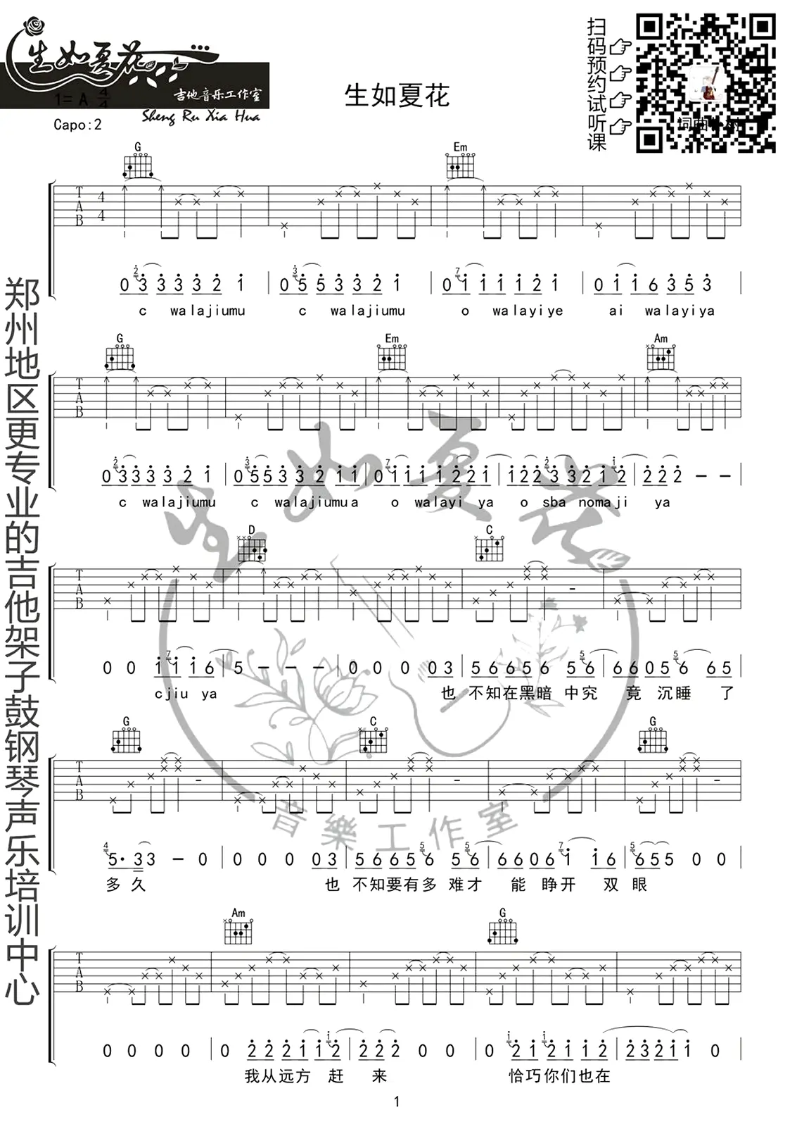 《生如夏花》吉他谱,朴树创作及演唱的一首歌曲,作词作曲均为朴树,收录在2003年发行的专辑《生如夏花》中。 歌曲原调A,吉他谱选调G,capo夹2品为原调,由生如夏花吉他音乐工作室编配出品。