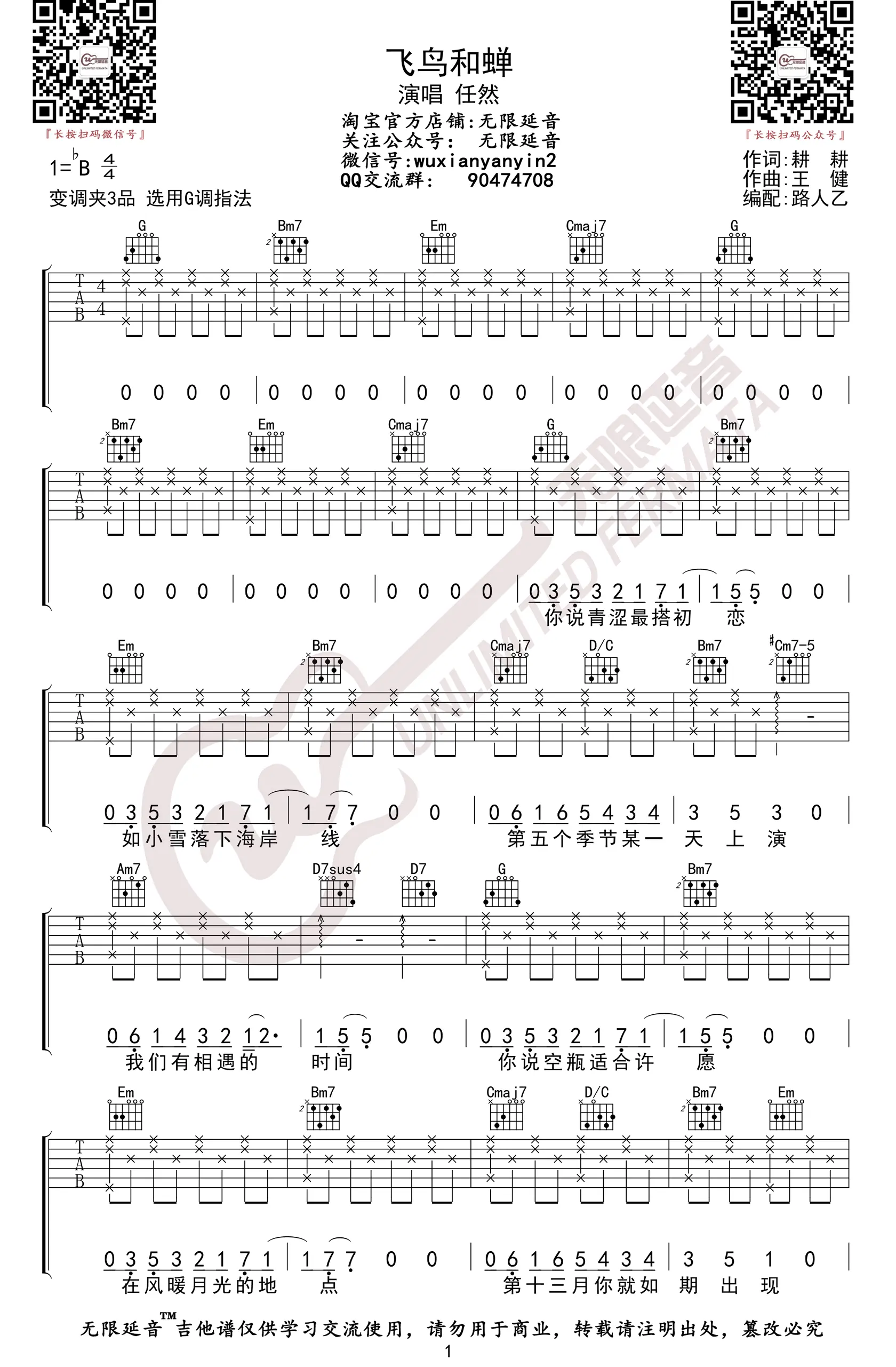 《飞鸟和蝉》吉他谱,任然演唱的一首流行抒情歌曲,由耕耕作词,Kent王健作曲,2020年7月3日以单曲形式发行,后收录于2021年发行的专辑《Ren然》中。歌曲原调降B,吉他谱选用G调指法编配,capo夹3品为原调,共2张图片谱,由无限延音编配出品。极具感染力的沙哑声线将疗伤情歌演绎得淋漓尽致,诠释相遇未必有结局却充满意义的遗憾——如飞鸟与蝉,终究错季离别。