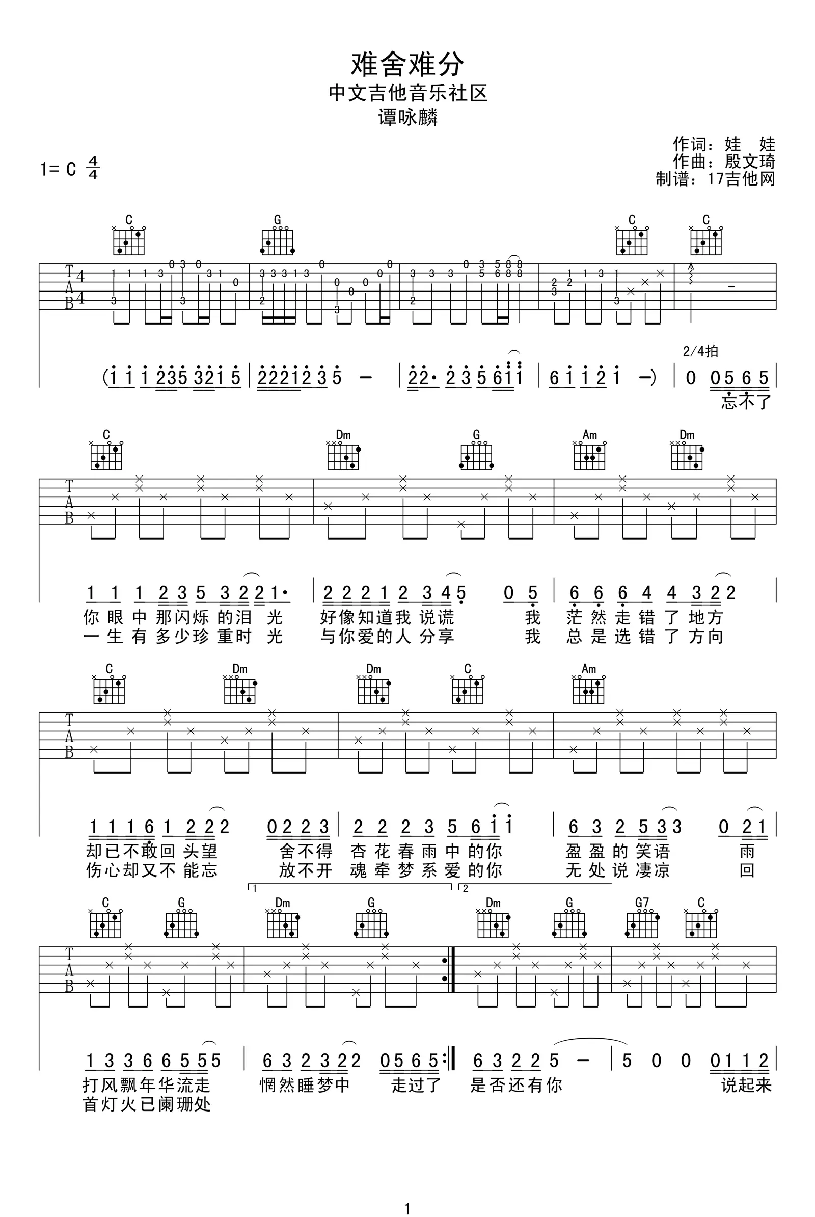 《难舍难分》吉他谱_谭咏麟/沈以诚_C调_高清六线谱_弹唱谱