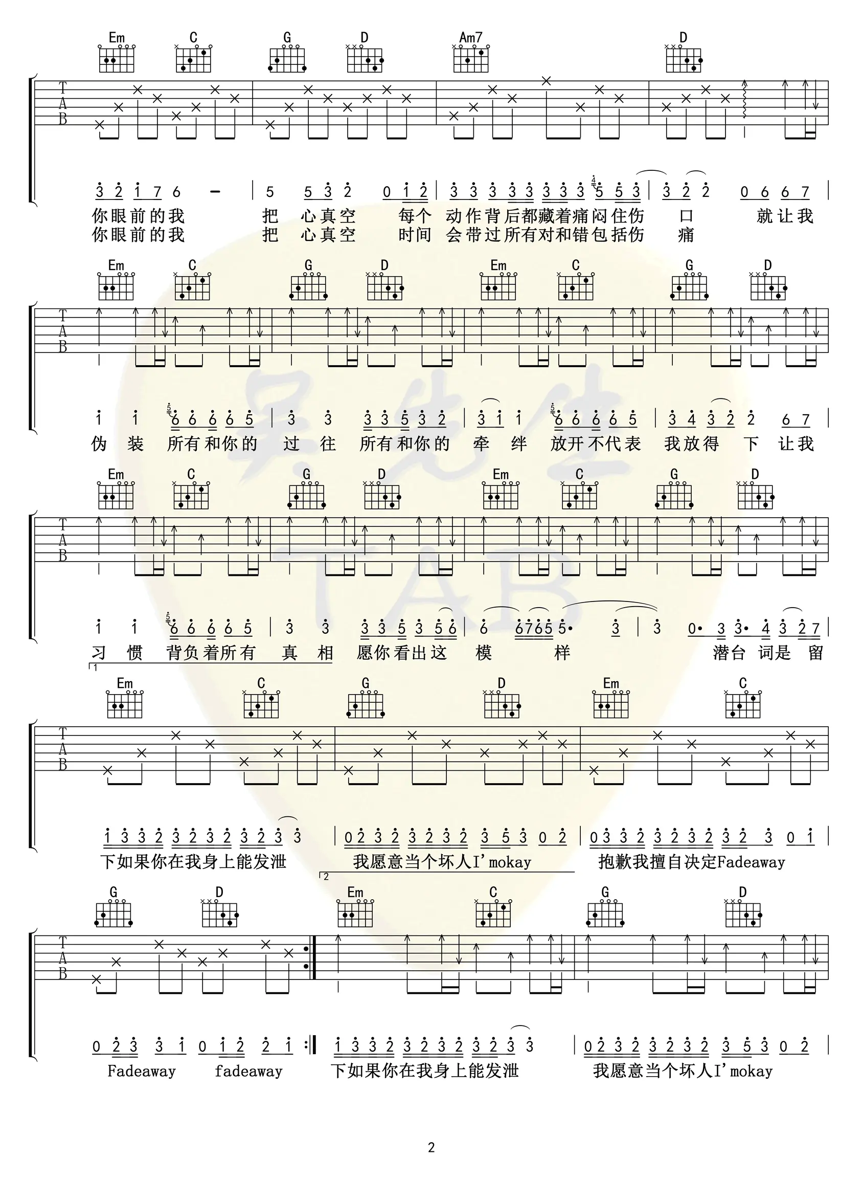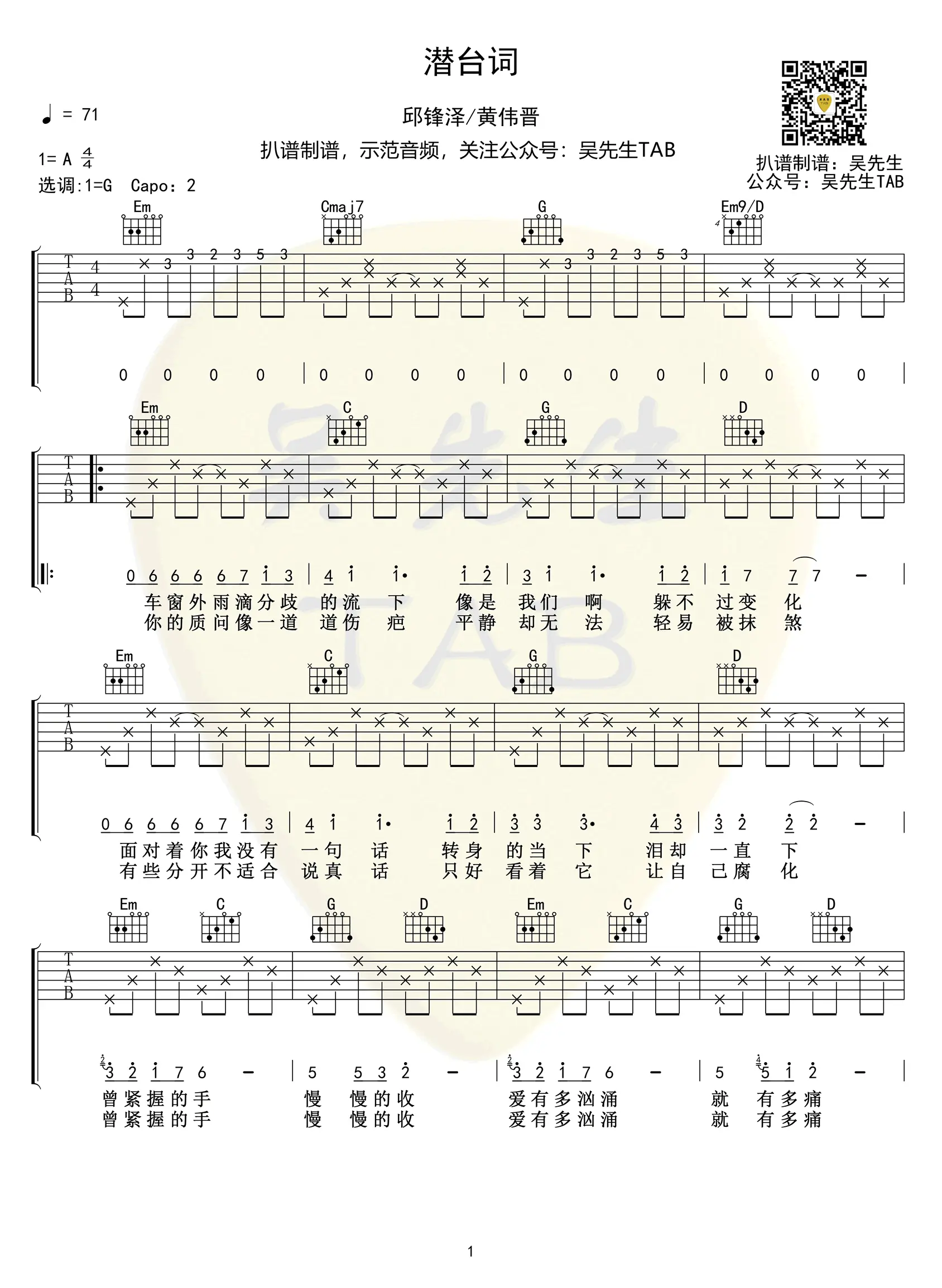 《潜台词》吉他谱_邱锋泽/黄伟晋_高清六线谱_G调弹唱谱_图片谱