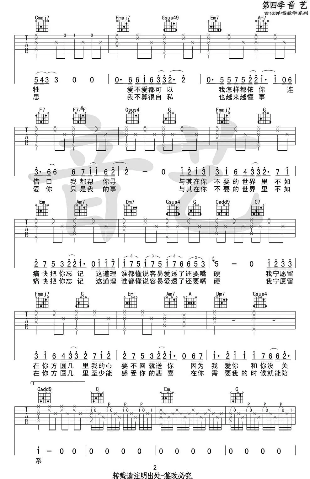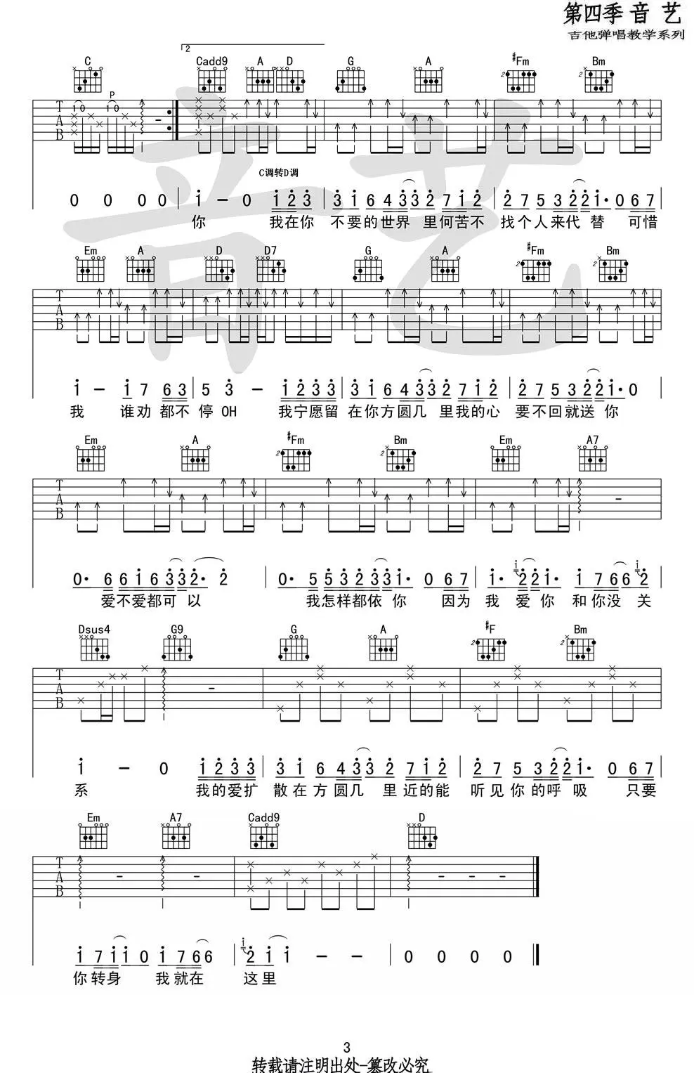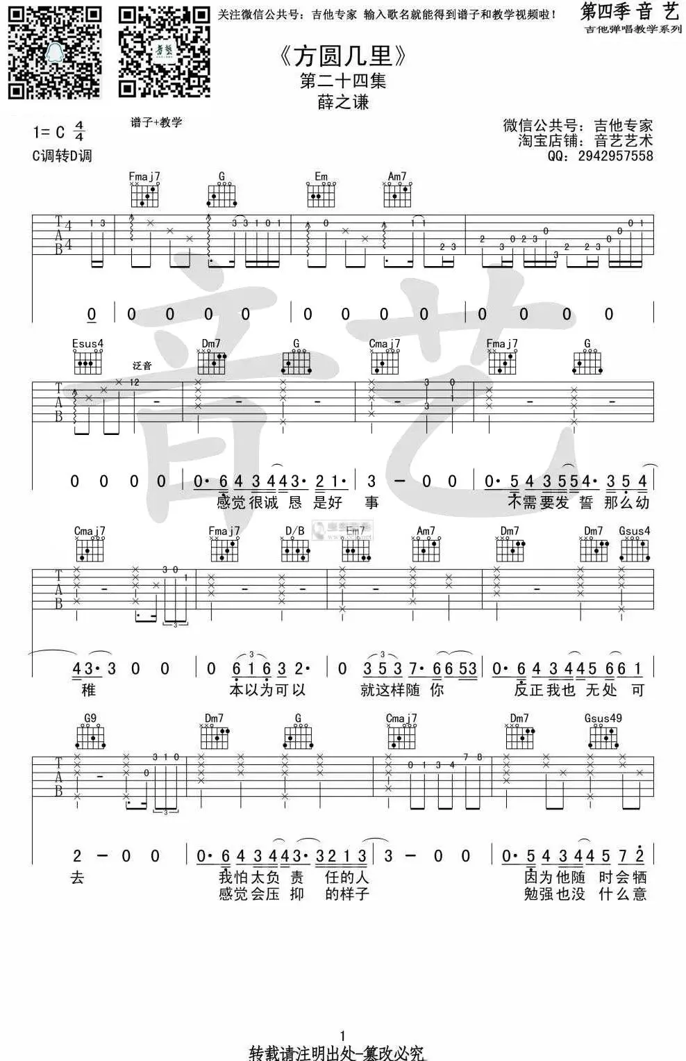 薛之谦《方圆几里》吉他谱,薛之谦词曲创作及演唱的一首歌,发行于2012年12月27日,收录于2013年发行的专辑《意外》中,该曲是微电影《最熟悉的陌生人》主题曲及电视剧《妈妈像花儿一样》插曲。吉他谱选用C调转D调指法编配,共6张图片谱,由艺音吉他弹唱教学编配出品。