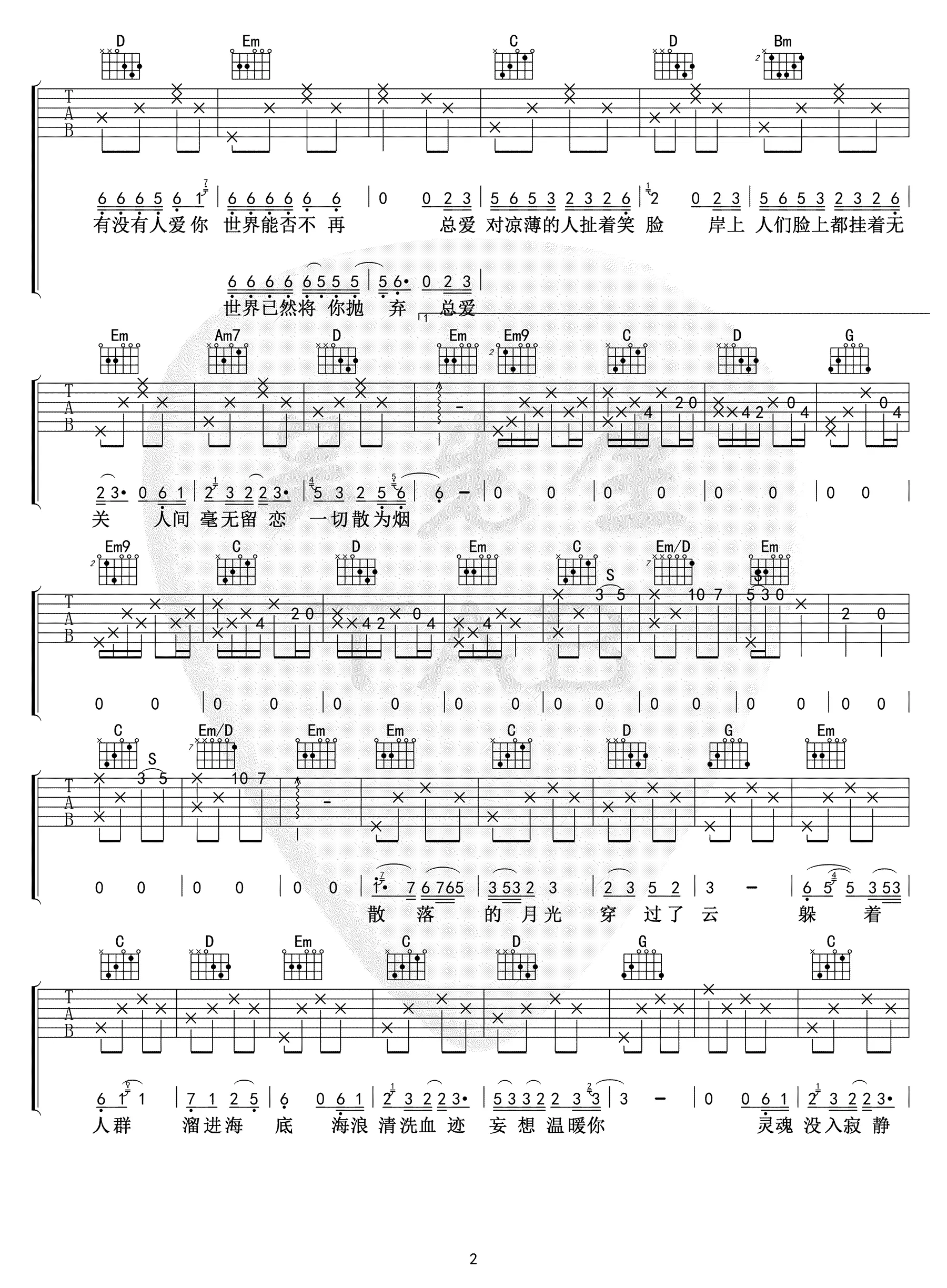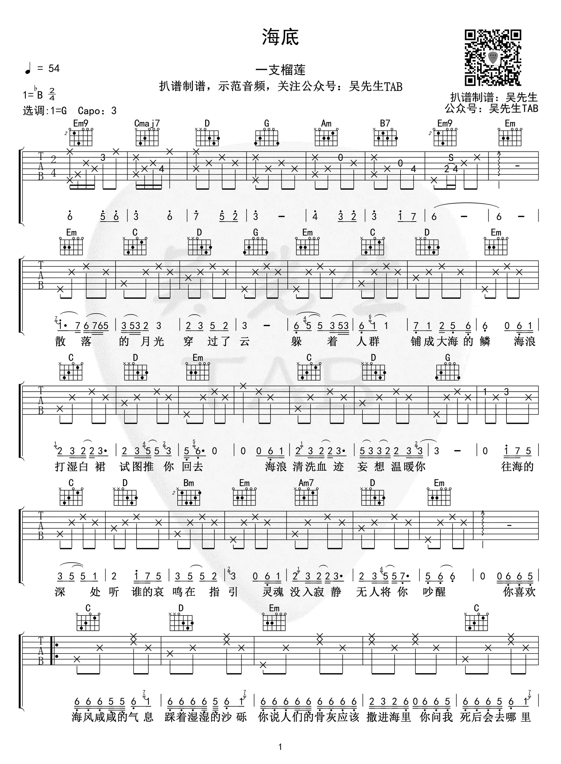 《海底》吉他谱,一支榴莲创作及演唱的一首歌曲,由一支榴莲作词,一支榴莲、寿延作曲,收录在2020年发行的专辑《海底》中。歌曲原调降B,吉他谱选调G调,变调夹夹3品,共3张高清图片谱,由吴先生编配出品。
