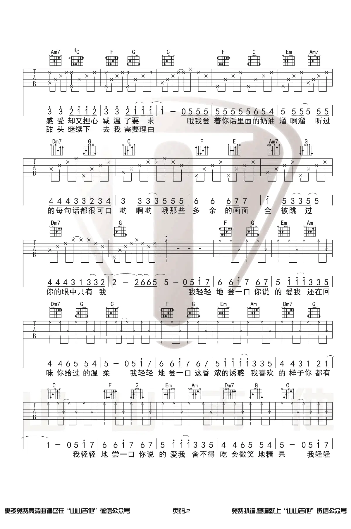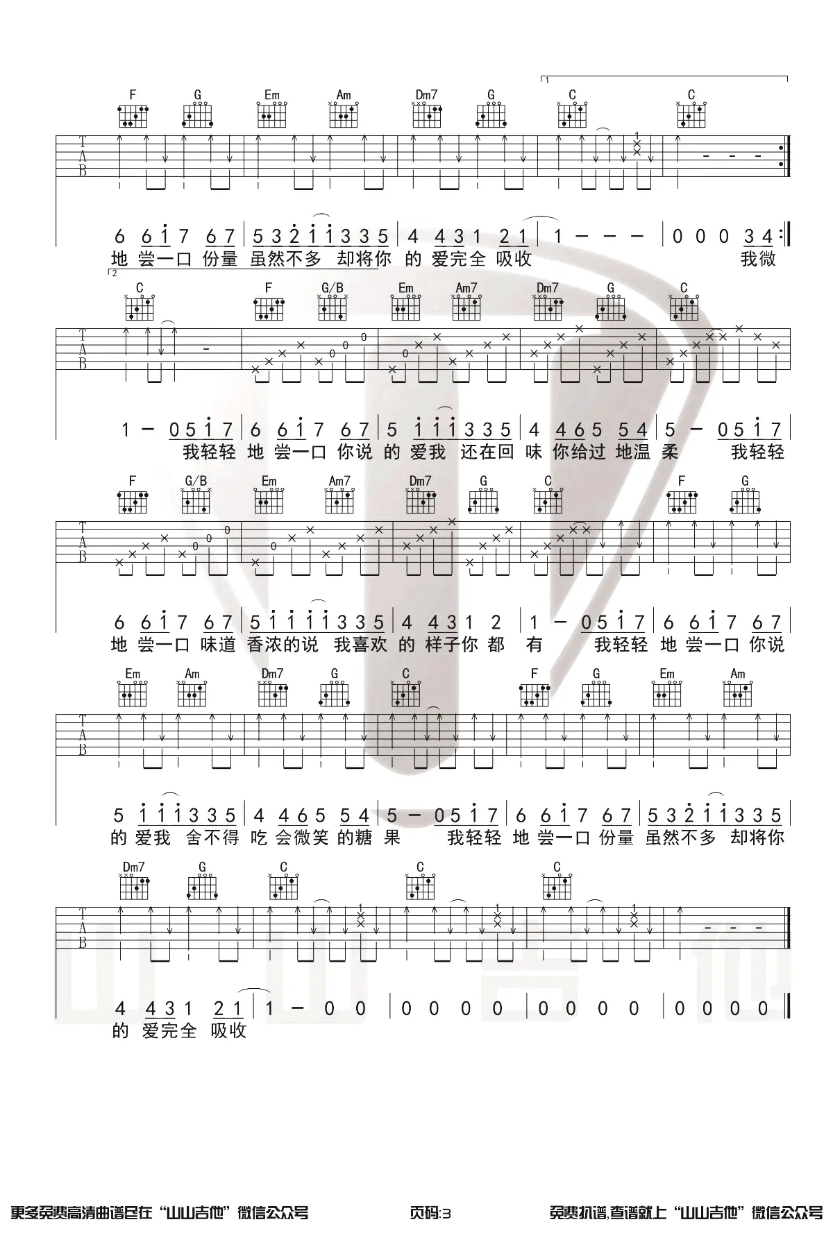 甜甜的吉他谱,周杰伦演唱的一首歌,由方文山作词,周杰伦作曲,2007年发行,收录于专辑《我很忙》中。歌曲原调F,吉他谱选调C调,capo夹4品,共3张图片谱,由山山吉他编配出品。