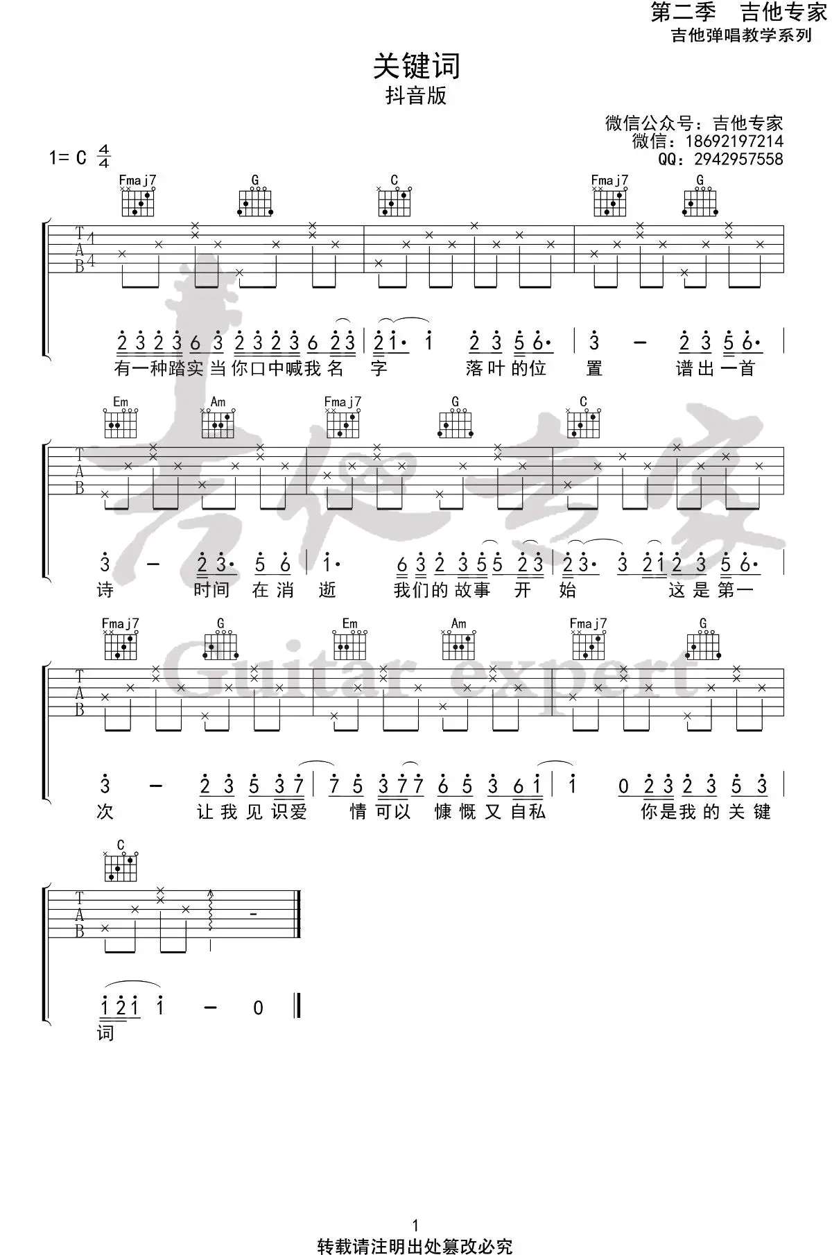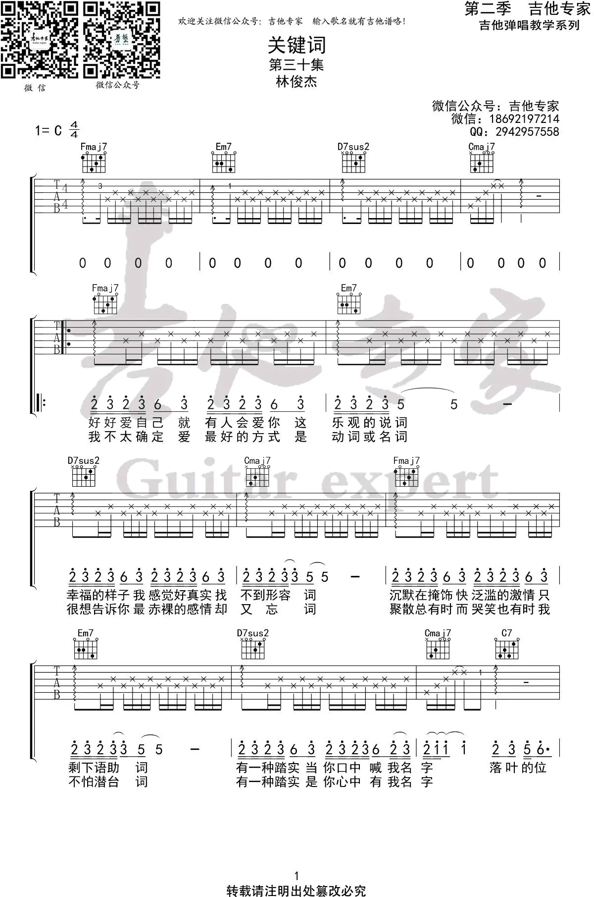 《关键词》吉他谱_林俊杰_C调抖音简单版+原版_弹唱谱_图片谱