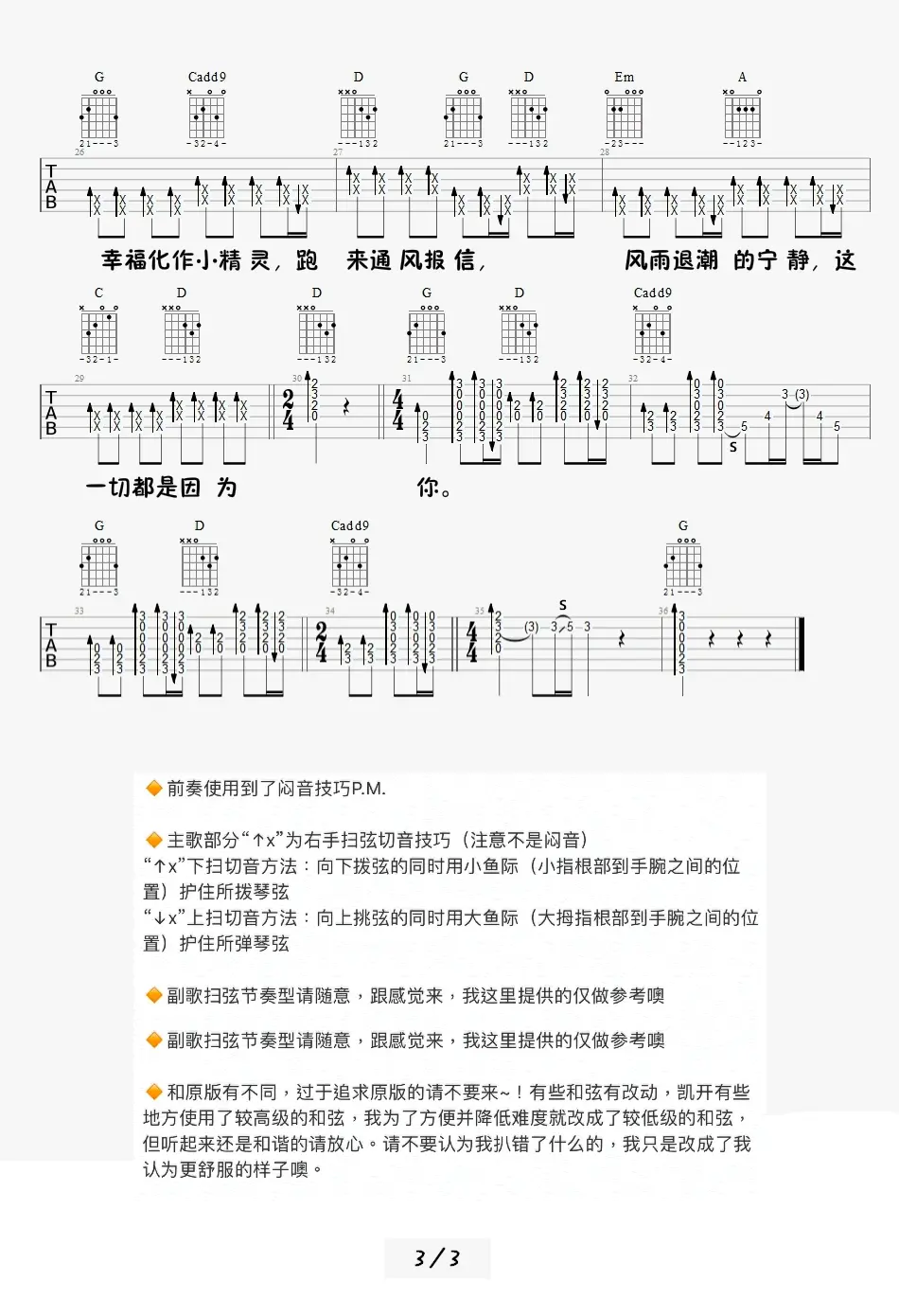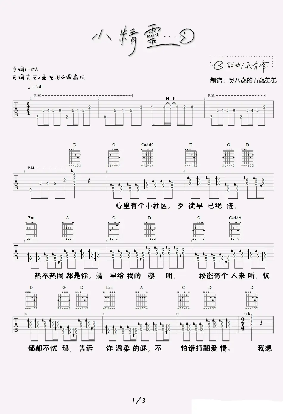 《小精灵》吉他谱,原唱TFBOYS,吴青峰与刘家凯重新演绎。吴青峰作词作曲,TFBOYS版发行于2016年,收录于单曲《小精灵》中。吉他谱选用G调指法编配,原调升A,capo夹3品为原调,共3张弹唱图片谱,由吴八岁的五岁弟弟制谱出品。