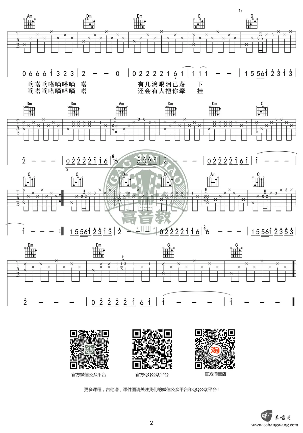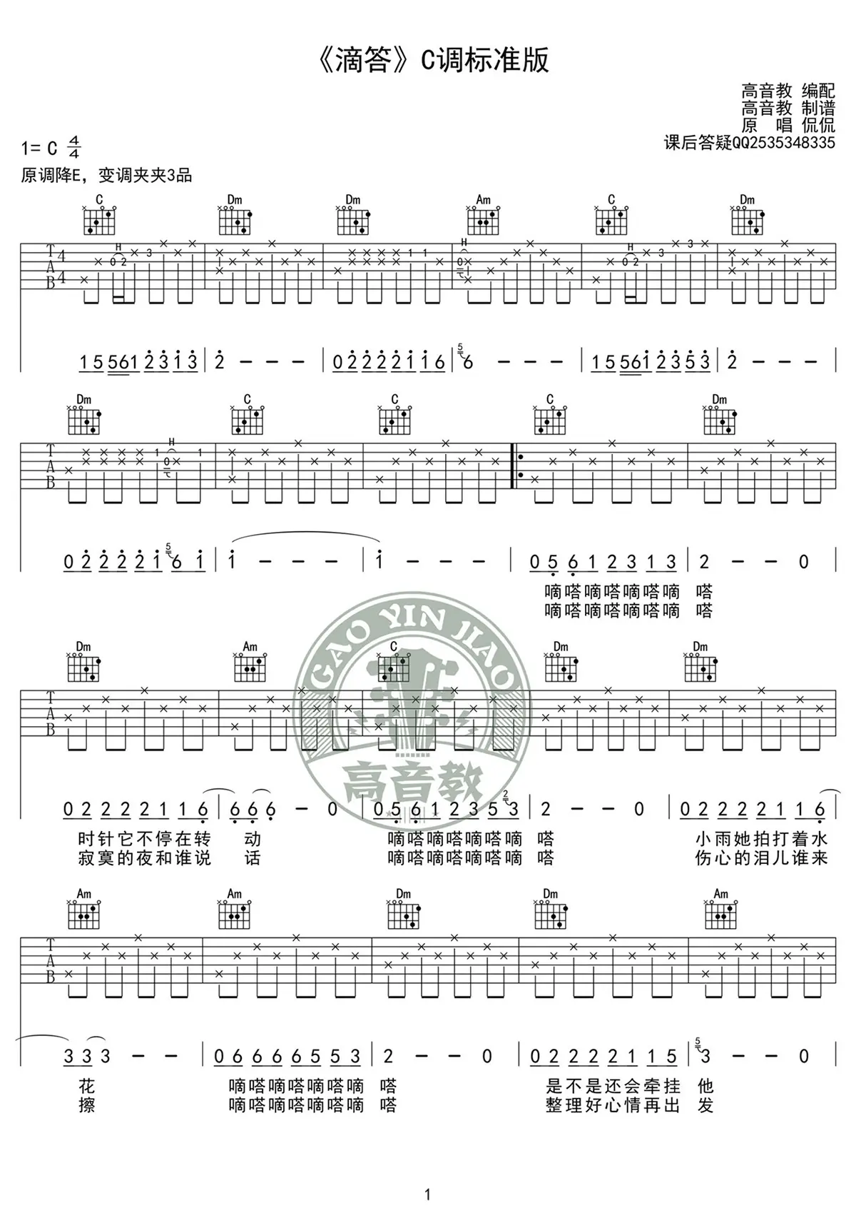 《滴答》吉他谱_侃侃_C调_高清弹唱谱_六线图片谱