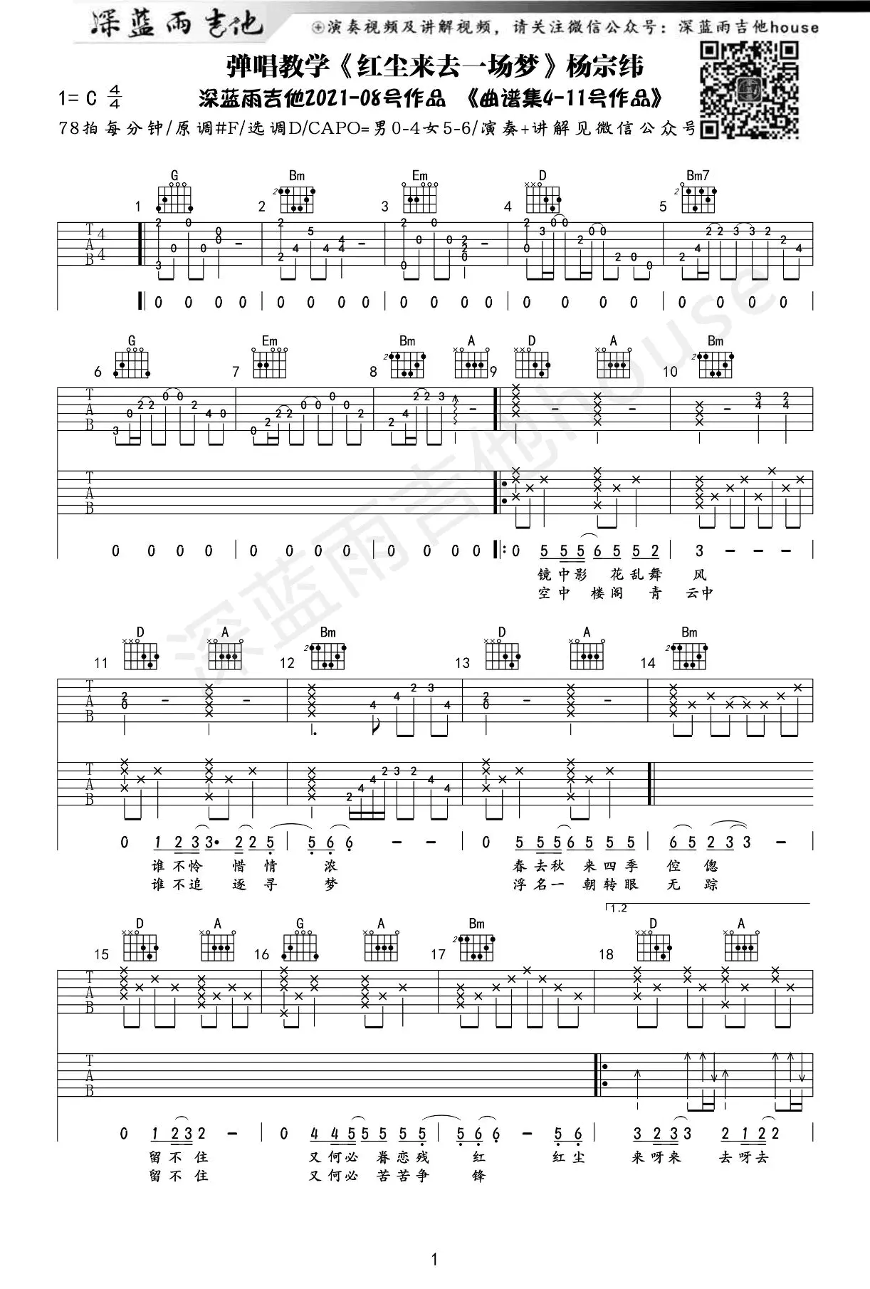 《红尘来去一场梦》吉他谱,杨宗纬翻唱版本,原唱巫启贤,由巫启贤作词作曲,2015年发行,收录于现场专辑《蒙面歌王 第六期》中。由深蓝雨吉他教学出品。