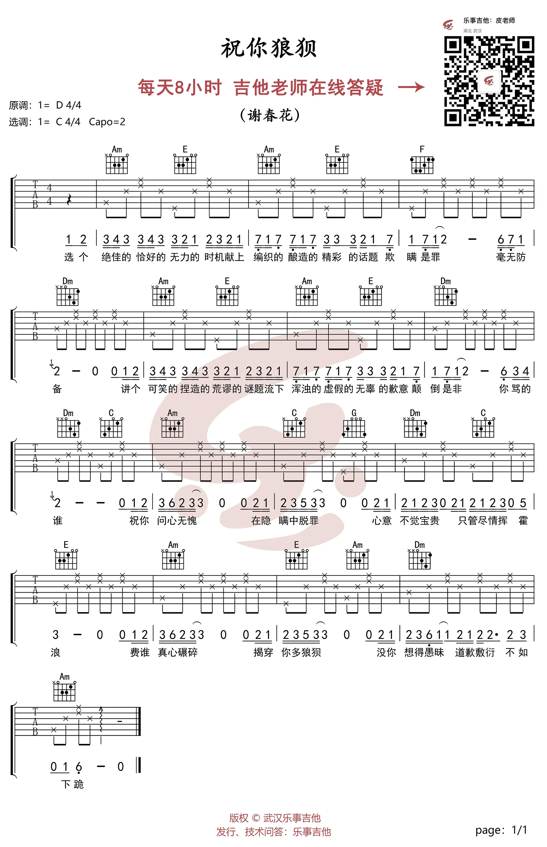 《祝你狼狈》吉他谱_谢春花_C调_六线谱_简单版图片谱