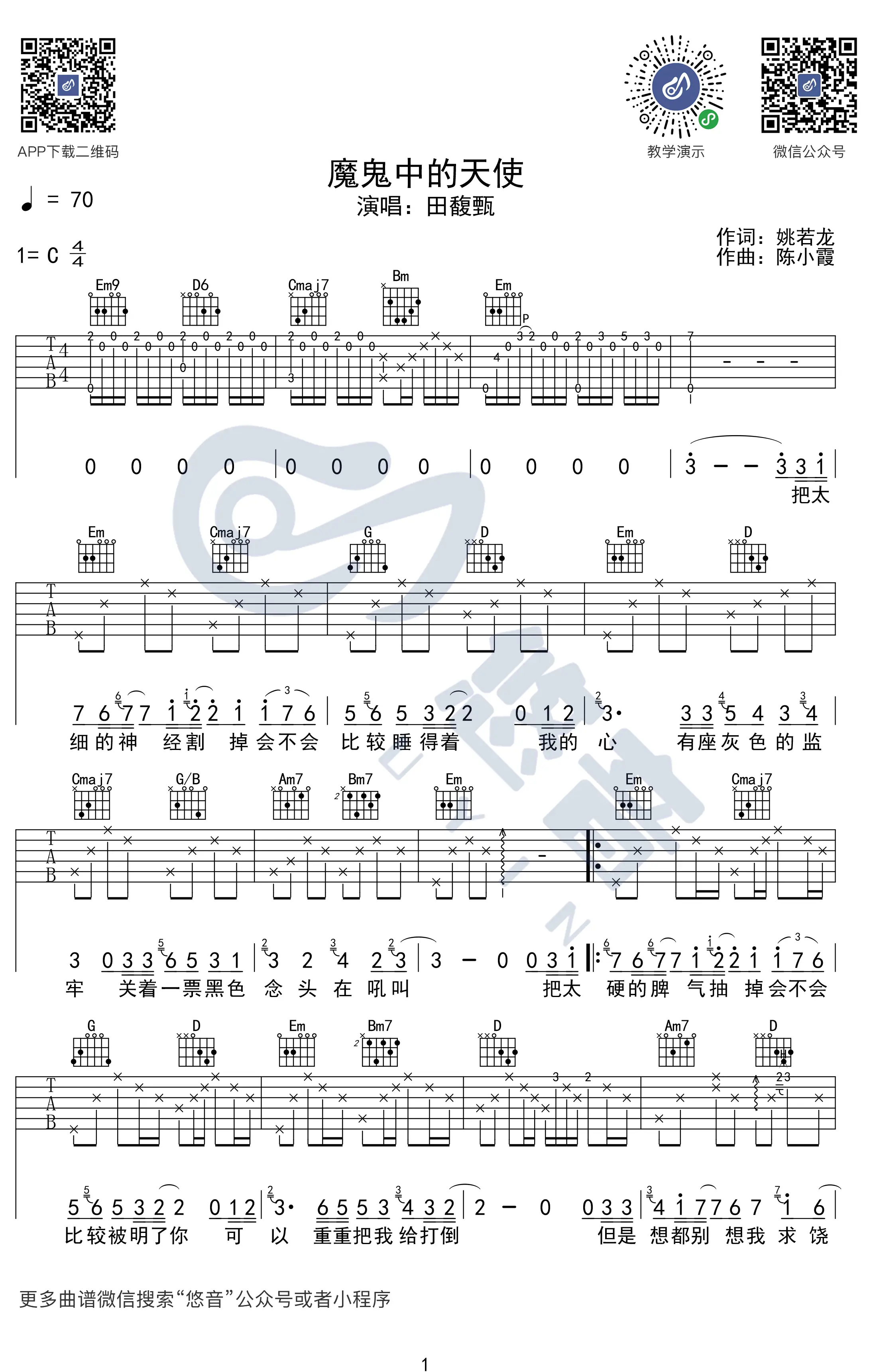 《魔鬼中的天使》吉他谱,田馥甄演唱的一首代表作,由姚若龙作词,陈小霞作曲,2011年发行,收录于专辑《My Love》中。吉他谱选调C调,共3张高清图片谱,由悠音制谱出品。