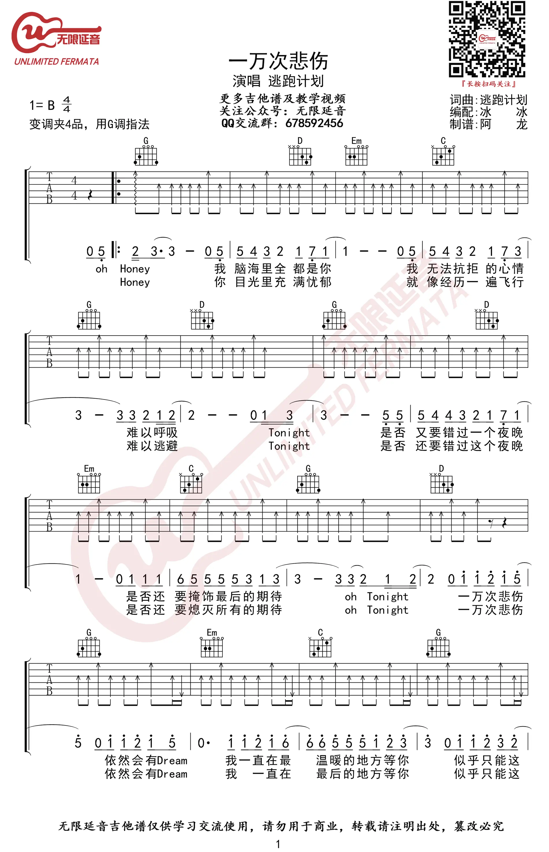 《一万次悲伤》吉他谱,逃跑计划演唱的一首歌曲,由毛川、李赤作词,逃跑计划乐队作曲,收录在2012年发行的专辑《世界》中,摇滚风格励志歌曲。歌曲原调B,吉他谱选用G调指法编配,capo夹4品,由无限延音编配出品。