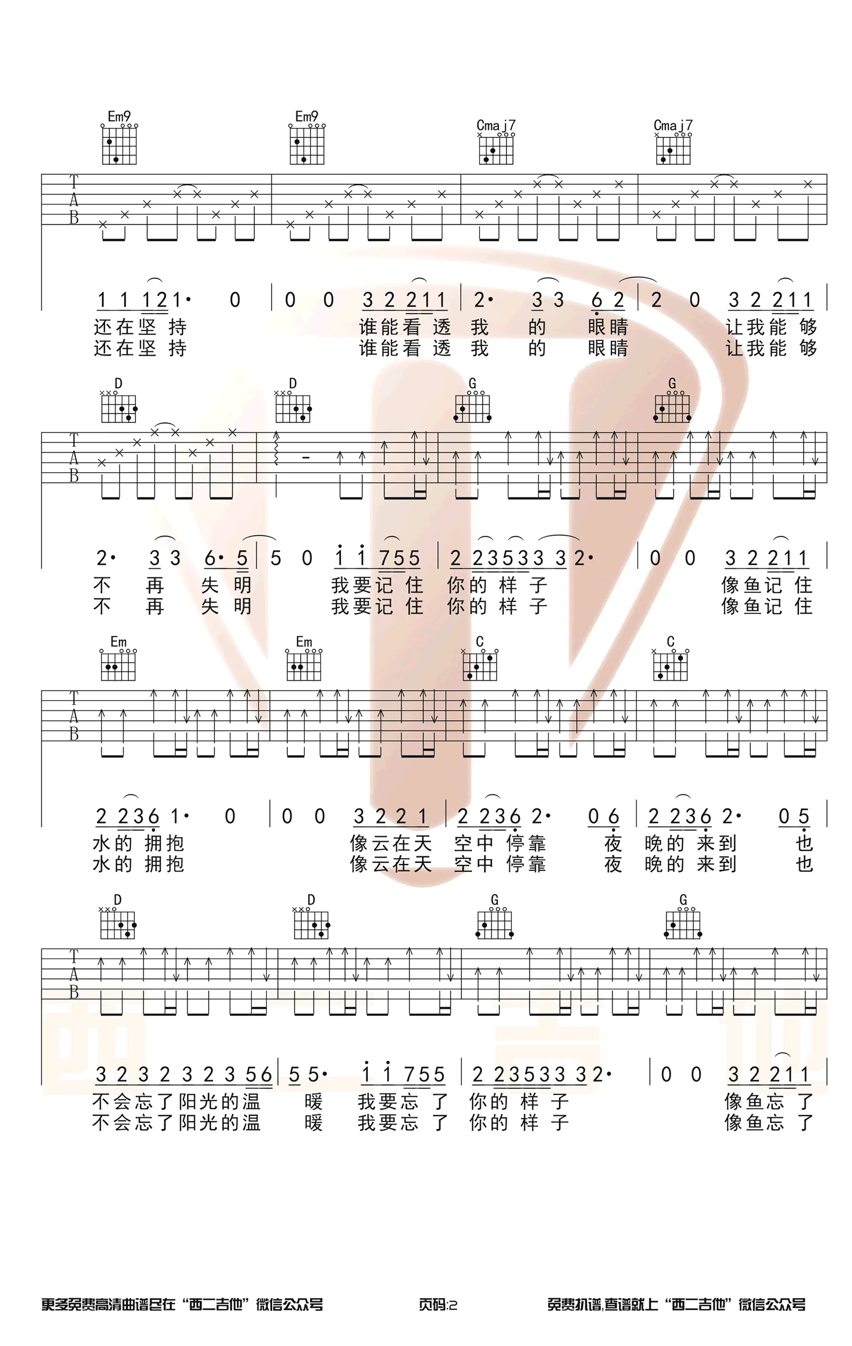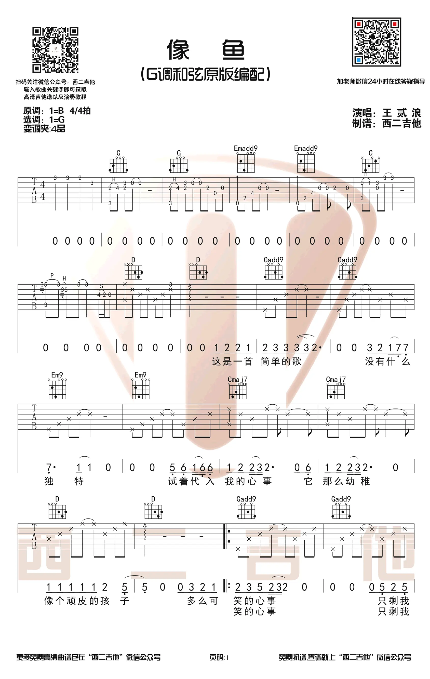 像鱼吉他谱_王贰浪_G调_高清六线弹唱谱_图片谱