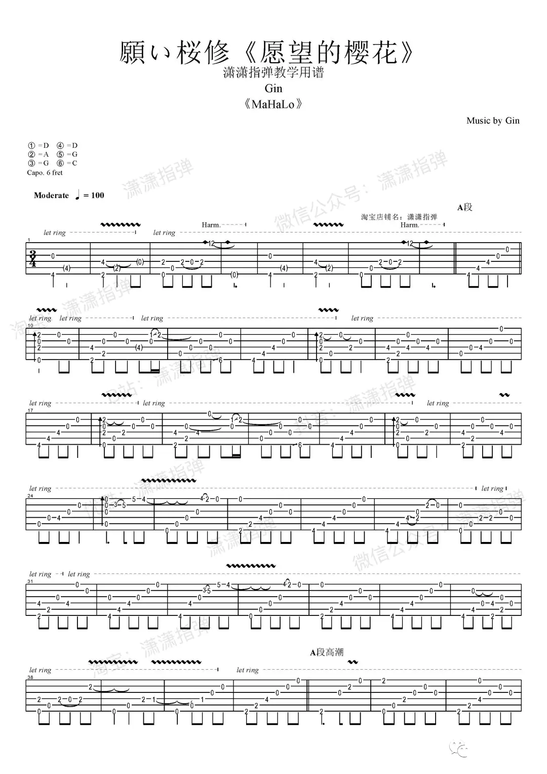 GIN《愿望的樱花》指弹谱,日本原声吉他演奏家GIN创作及演奏的纯音乐作品,收录于2011年发行的专辑《MaHaLo》中。吉他谱采用特殊调弦(D A G D G C),演奏难度简单但需注重情感处理与音量控制,尤其需把握揉弦技巧及力度变化。由潇潇指弹编配出品。