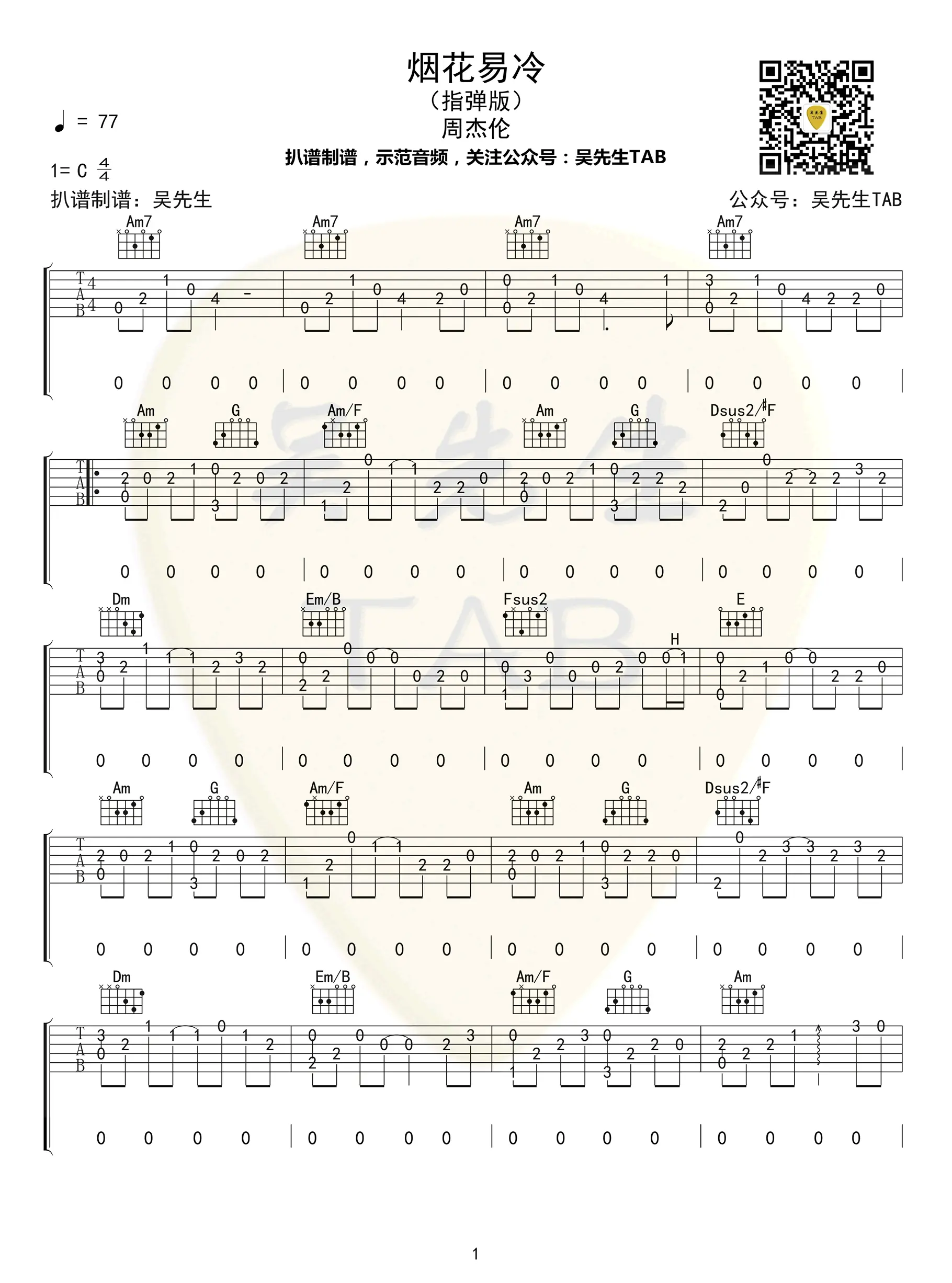 烟花易冷指弹谱,周杰伦演唱歌曲,由方文山作词,周杰伦作曲,收录于2010年发行的专辑《跨时代》中,中国风经典曲目。吉他谱选用C调指法编配,由吴先生编配出品。