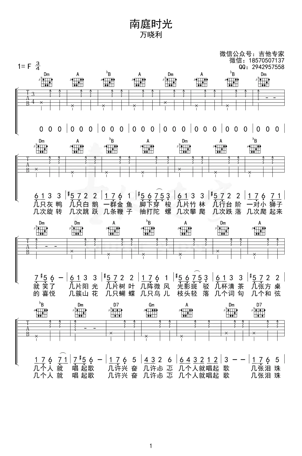 《南庭时光》吉他谱,万晓利演唱,由万晓利作词作曲,2023年发行,收录在专辑《我们民谣2022 第8期》中。 歌曲原调升C,吉他谱选用C调指法编配,capo夹1品,共2张图片谱,由吉他专家编配出品。