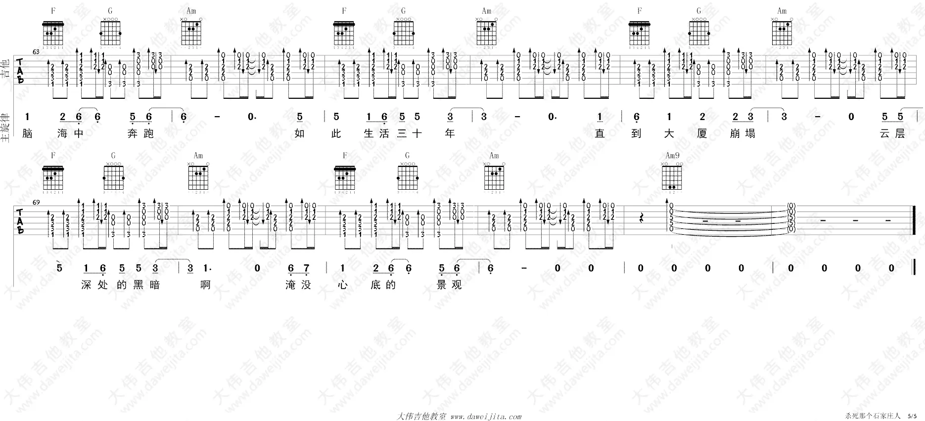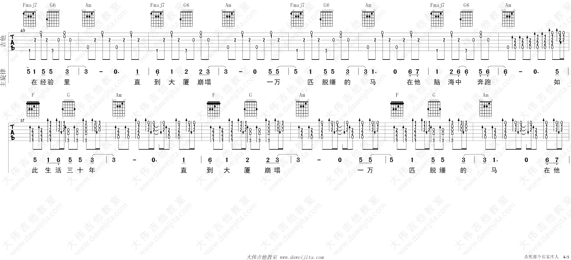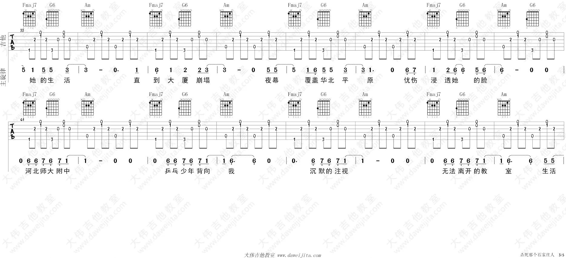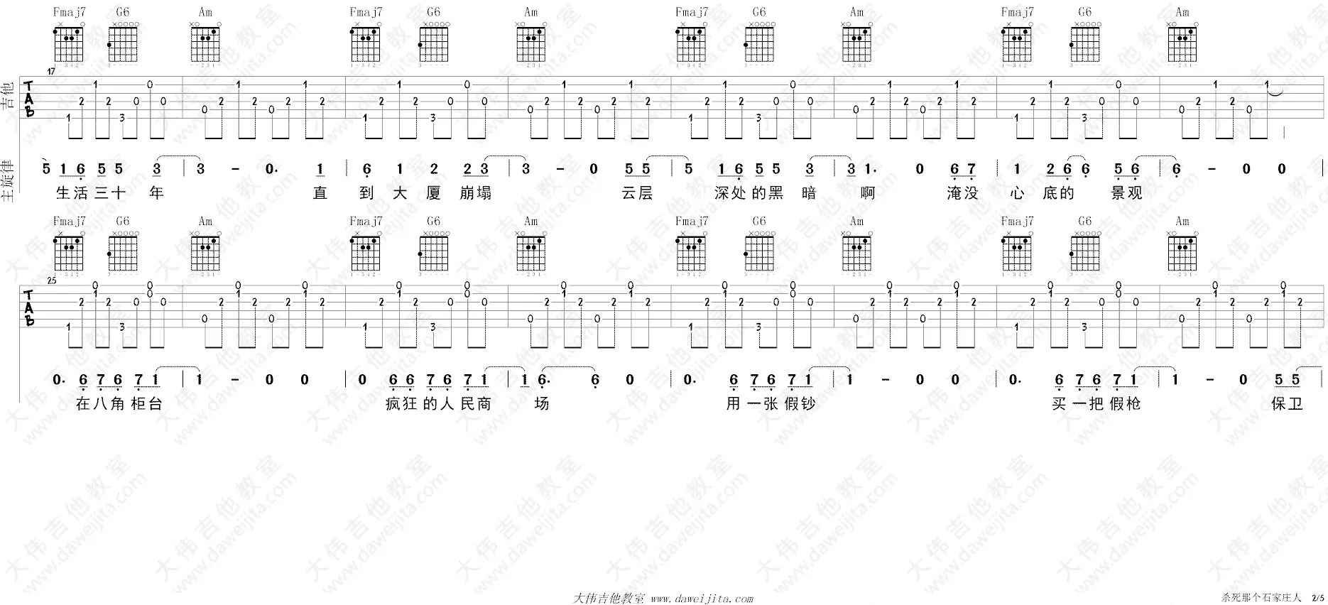 《杀死那个石家庄人》吉他谱,万能青年旅店演唱的一首歌曲,由姬赓作词,董亚千作曲,收录于2010年发行的专辑《万能青年旅店》中。 吉他谱选用C调指法编配,男生capo夹2品,女生capo夹5品,共5张高清图片谱,由大伟吉他编配出品。