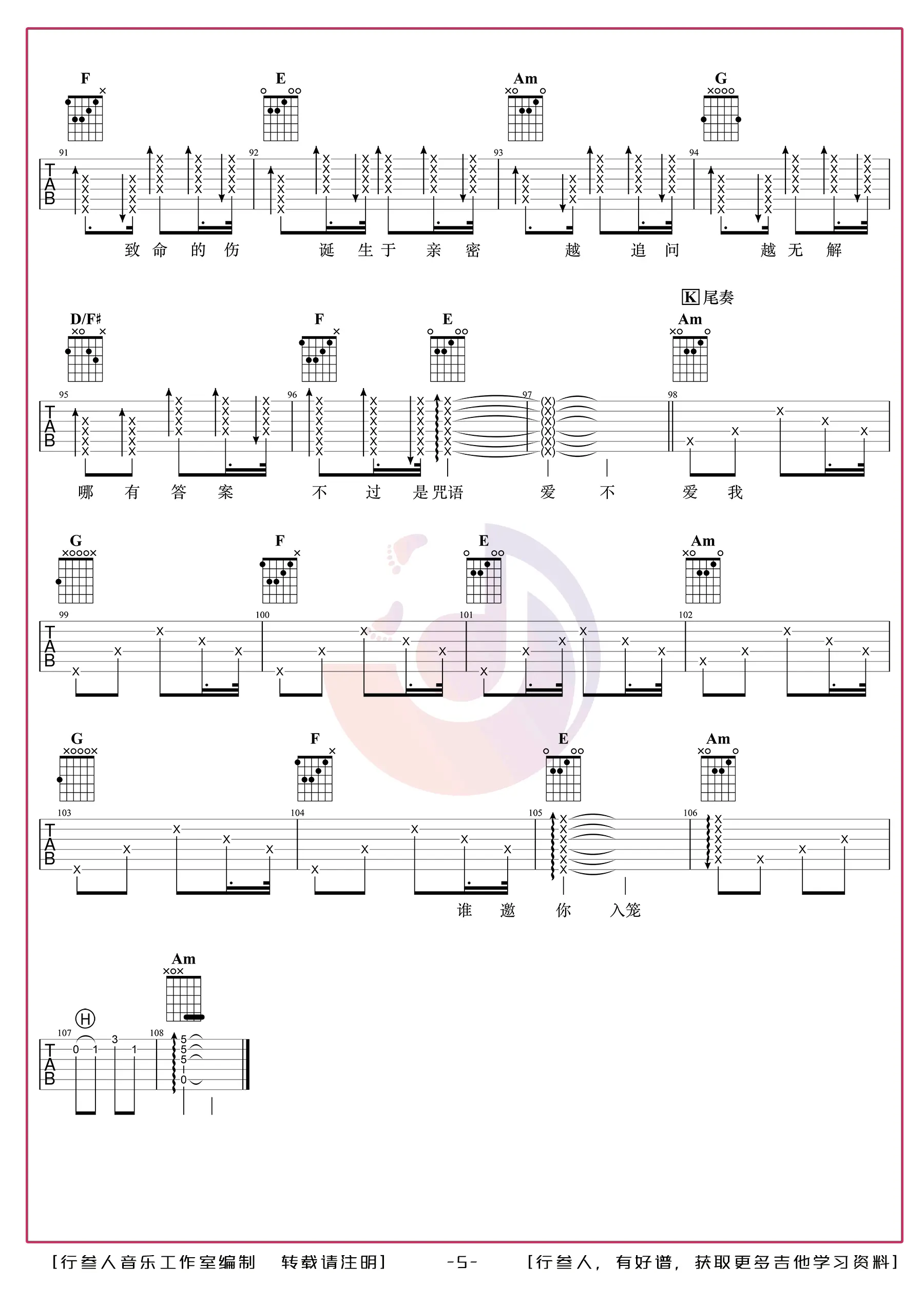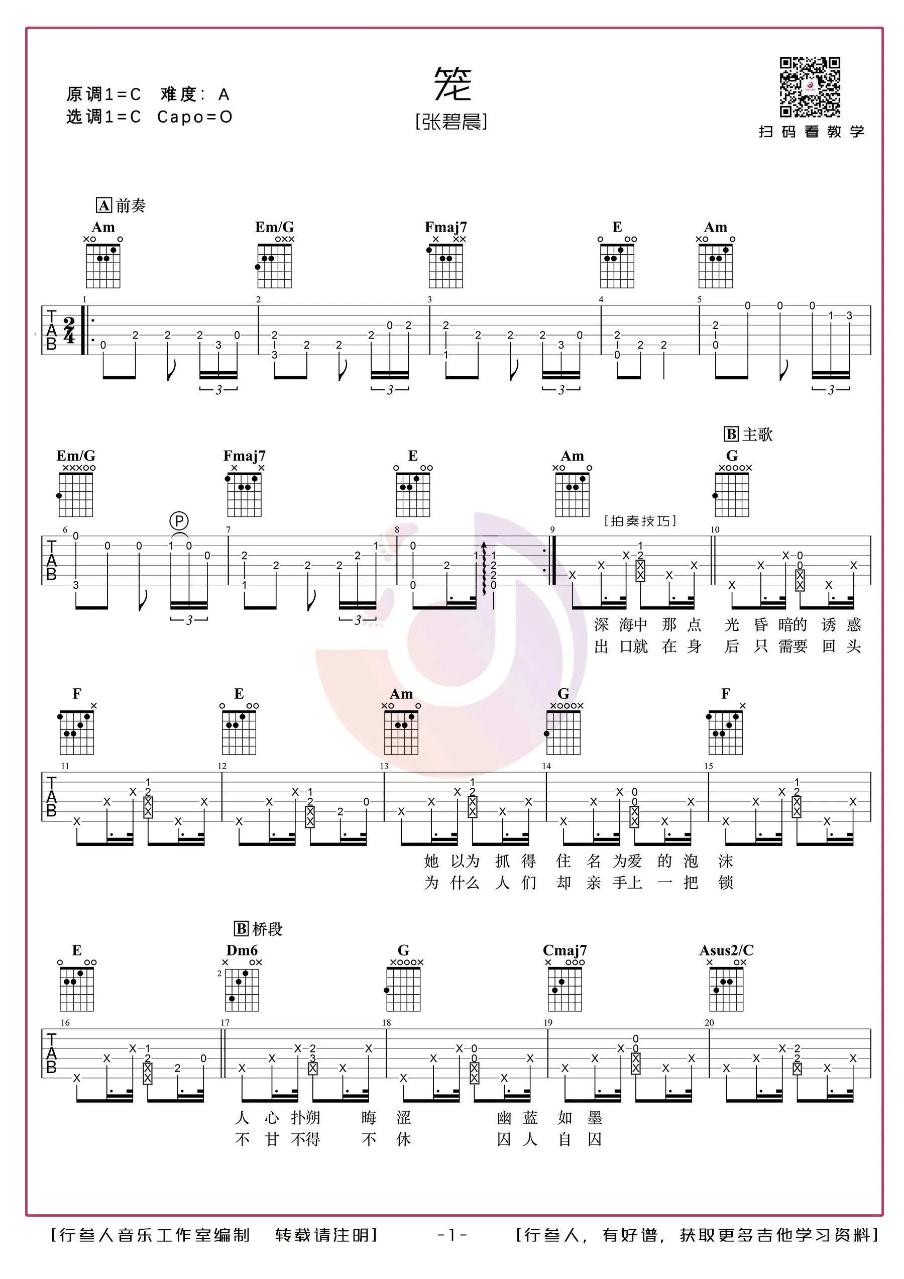 《笼》吉他谱,张碧晨演唱的一首歌,由唐恬作词,钱雷作曲,收录于2023年发行的专辑《笼》中,该曲是电影《消失的她》的主题曲。 吉他谱选用C调指法编配,共5张高清图片谱,由行叁人吉他编配出品。