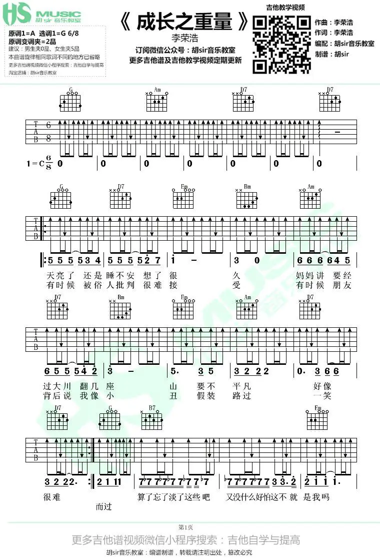 《成长之重量》吉他谱,李荣浩作词、作曲并演唱,2018年发行,收录于专辑《耳朵》中,同时也是电影《动物世界》成长版片尾曲。歌曲原调A,吉他谱选用G调指法编配,男生无需使用变调夹,女生建议变调夹夹5品,由胡Sir编配出品。