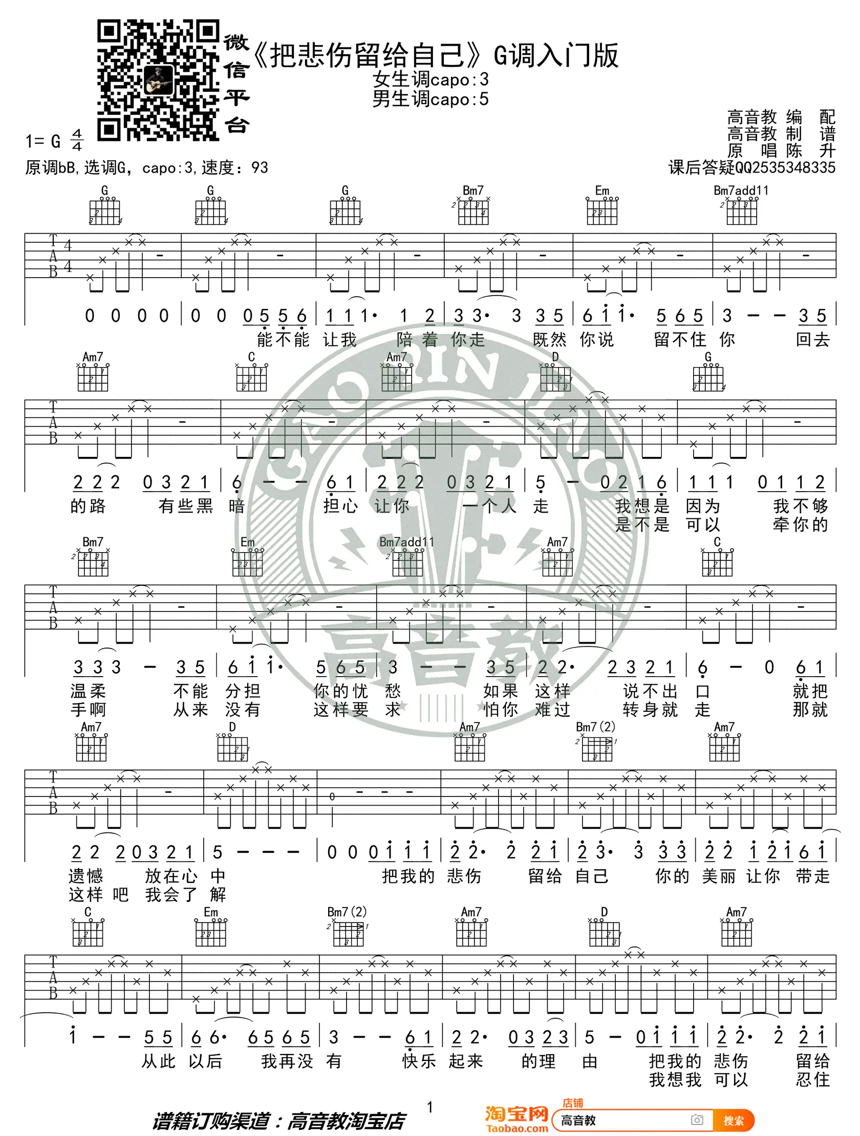 《把悲伤留给自己》吉他谱,陈升演唱的一首经典情歌,由陈升作词作曲,收录于1991年发行的专辑《私奔》中。 吉他谱选调G调,演奏难度简单,由高音教编配出品。