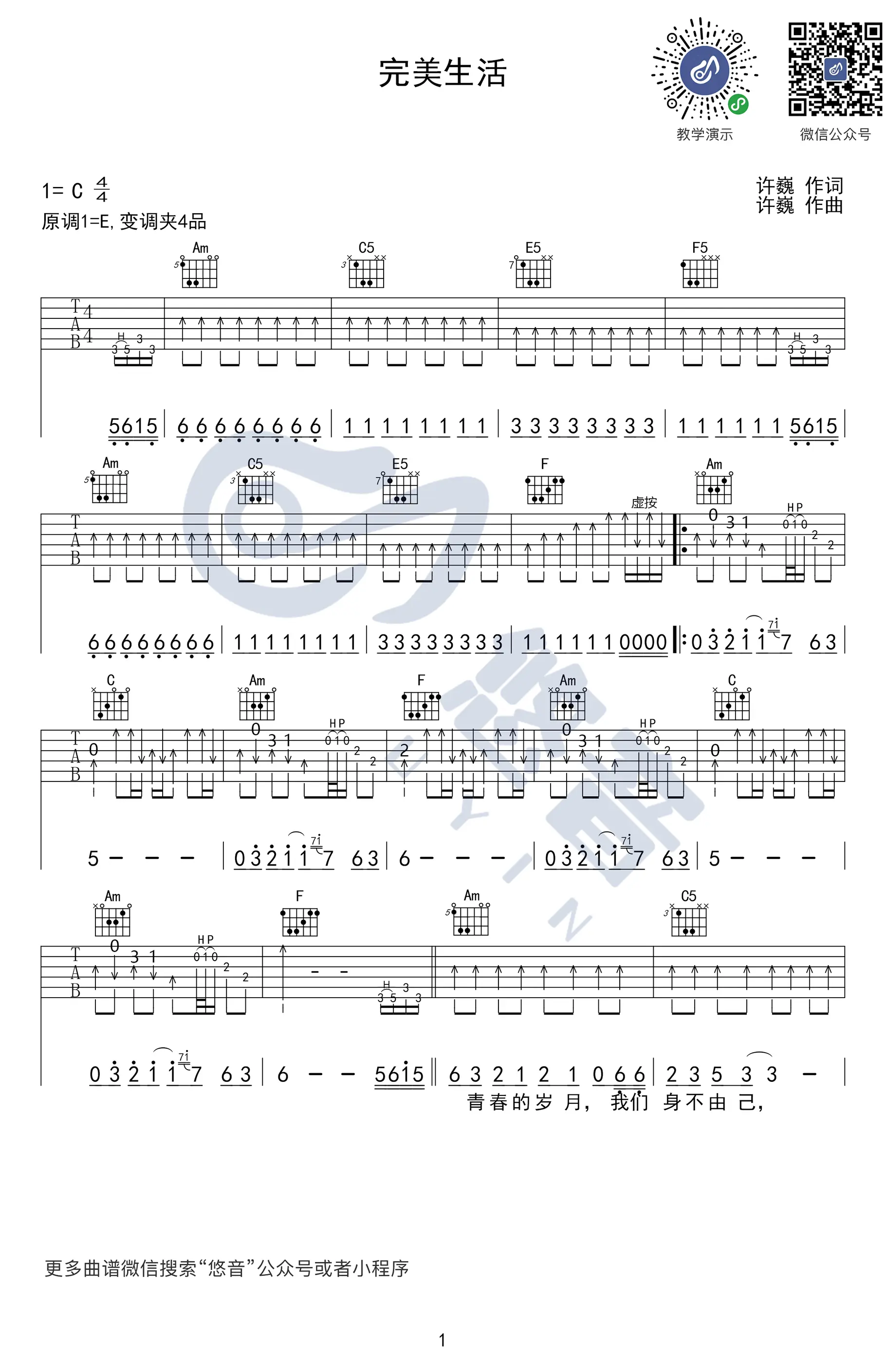 《完美生活》吉他谱,许巍创作及演唱的一首歌,许巍作词、作曲,收录在2002年发行的专辑《时光·漫步》中。 歌曲原调E,吉他谱选用C调指法编配,capo夹4品为原调,由悠音编配出品。