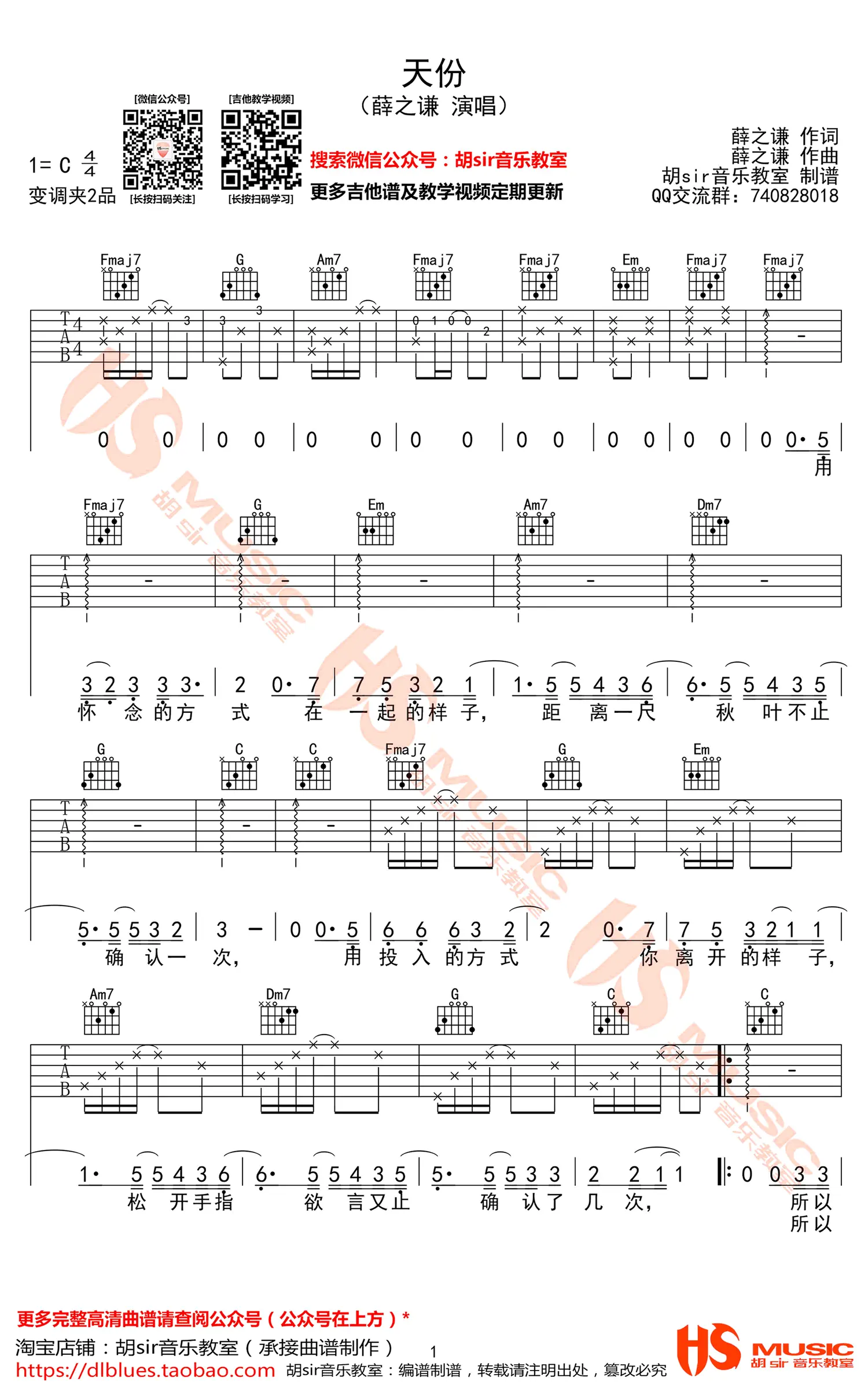 天份吉他谱_薛之谦_C调指法_弹唱谱_图片谱