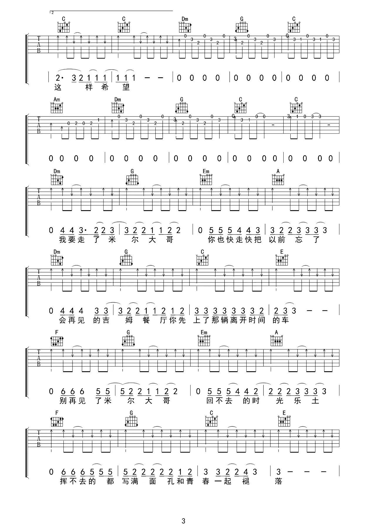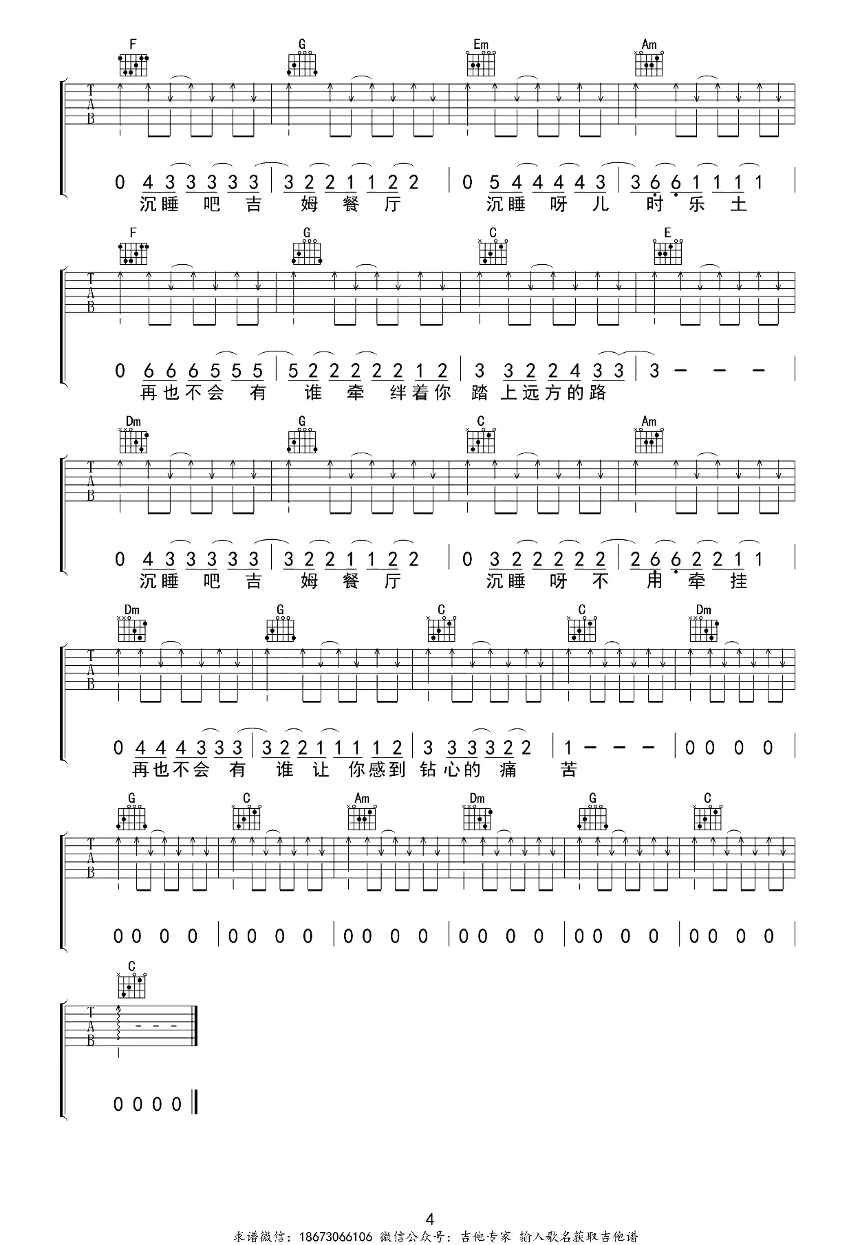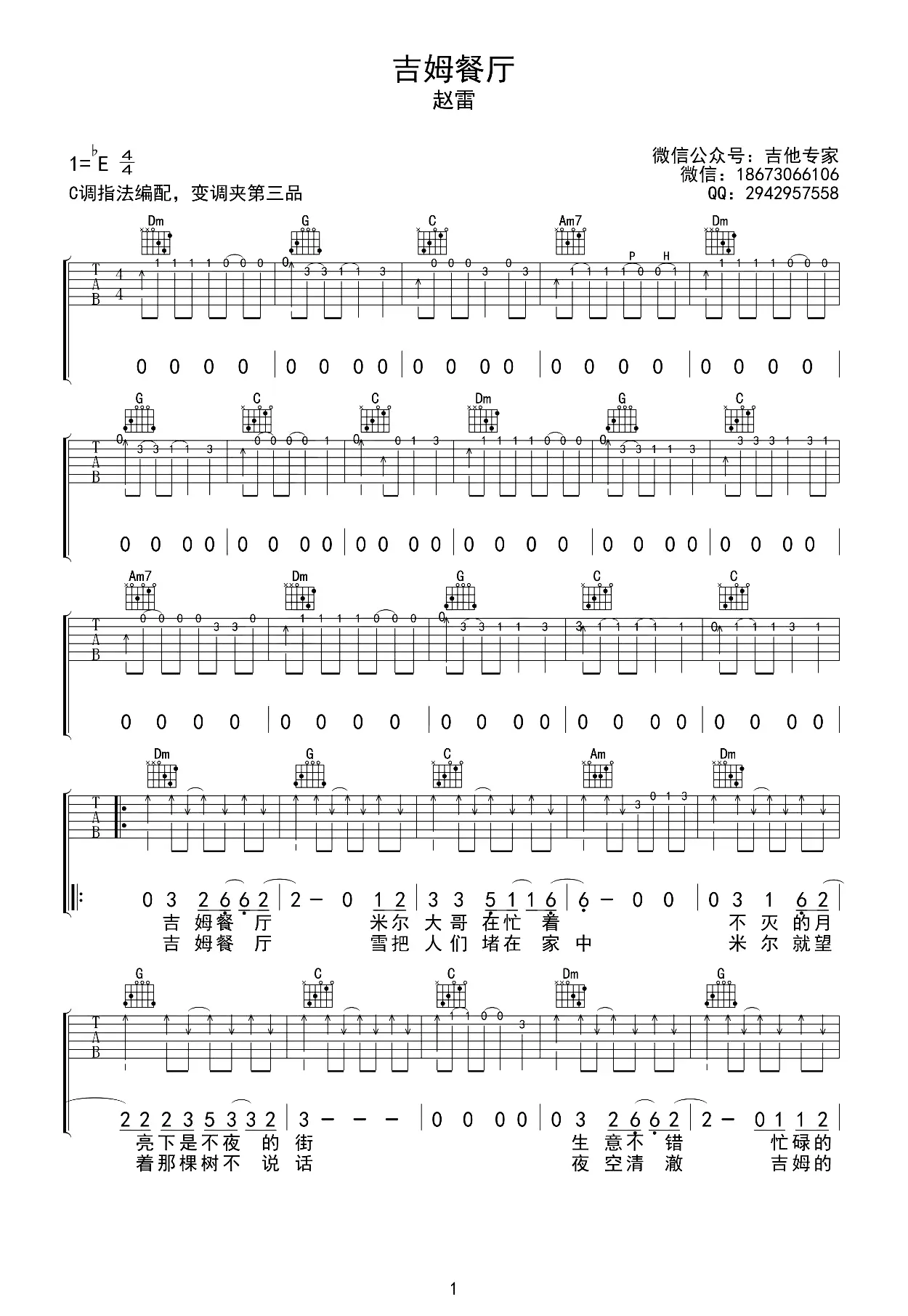 《吉姆餐厅》吉他谱,赵雷作词作曲及演唱的一首民谣歌曲,收录于2014年发行的专辑《吉姆餐厅》中。歌曲原调降E,吉他谱选用C调指法编配,capo夹3品为原调,共4张图片谱,由吉他专家编配出品。