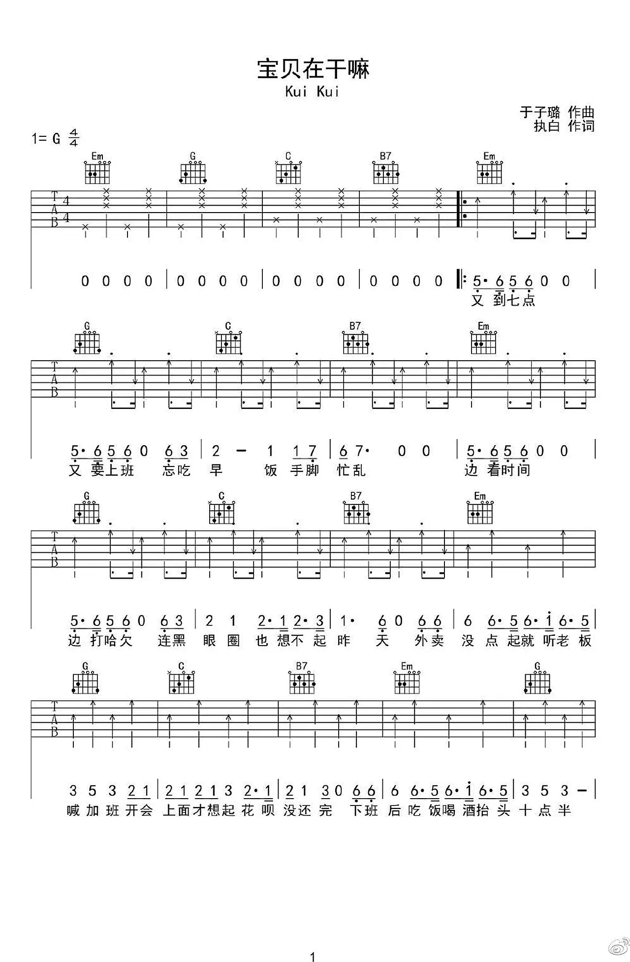 《宝贝在干嘛》吉他谱,KUIKUI演唱的一首歌曲,由执白作词,于子璐作曲,收录于2023年发行的专辑《宝贝在干嘛》中,网络热门歌曲。 吉他谱选用G调指法编配,共2张图片谱。