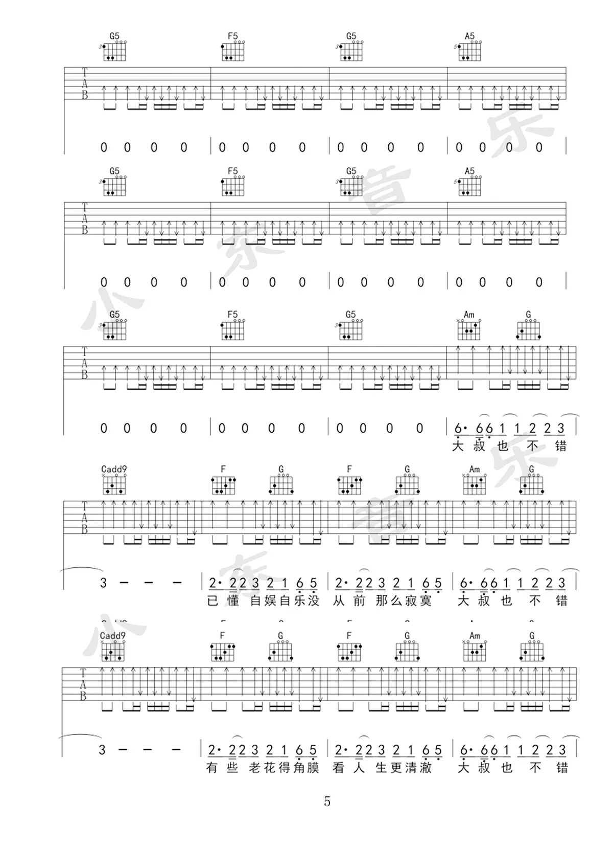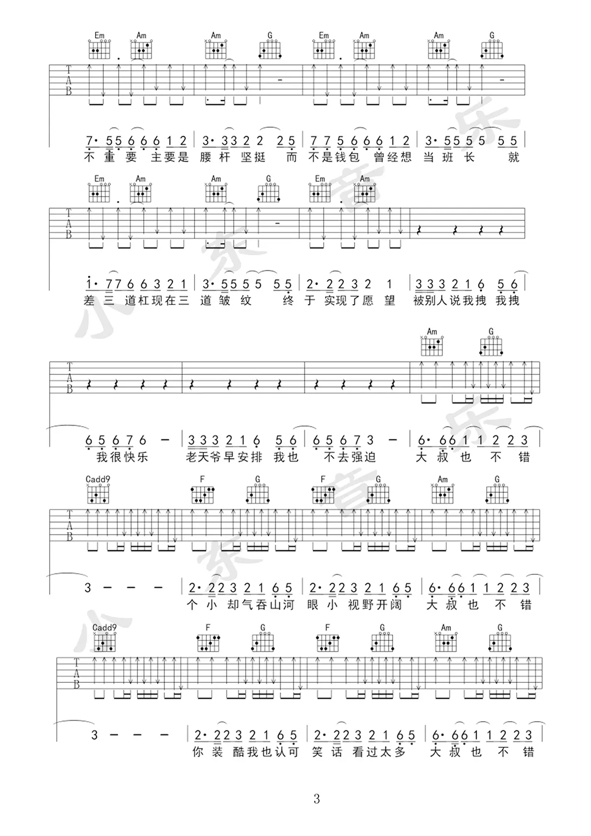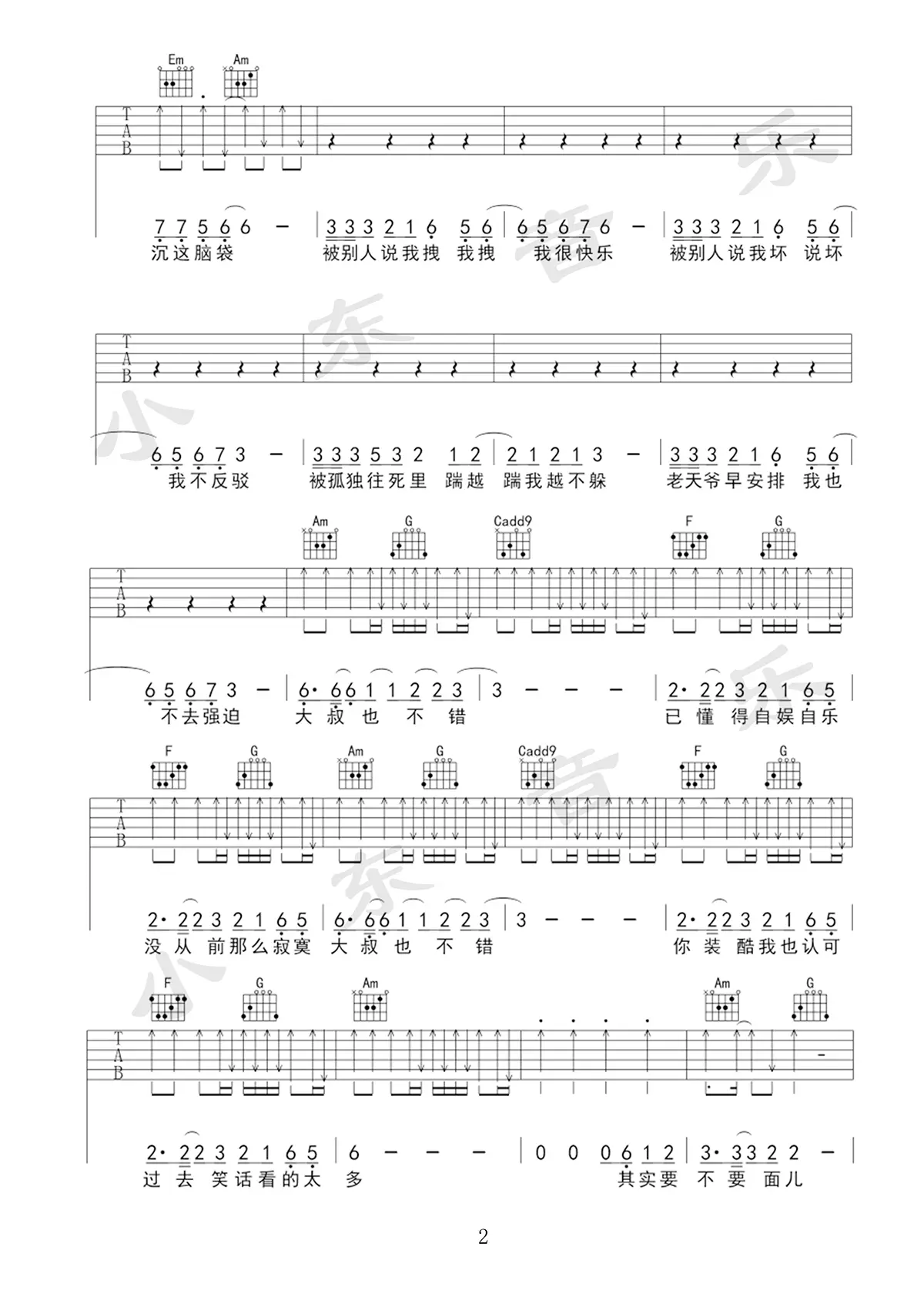 《大叔也不错》吉他谱,杨坤和黄渤演唱的一首合唱歌曲,由梁芒作词,Ant Whiting作曲,2017年发行,收录于2017年发行的专辑《孤独颂》中,曲风欢快动感。歌曲原调D,变调夹夹2品,共3张高清图片谱,由易唱制谱出品。
