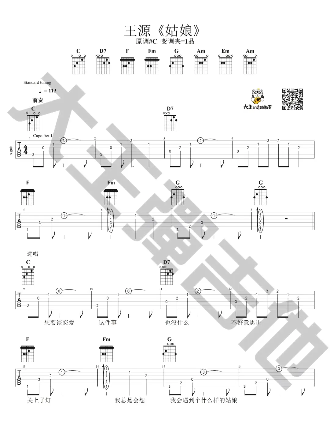 王源《姑娘》吉他谱,王源演唱的一首原创歌曲,由王源作曲,王源、赵英俊作词,2019年发行,收录在专辑《我是唱作人 第4期》中。歌曲原调#C,吉他谱选调C,capo夹1品为原调,共6张图片谱,由大王弹吉他编配出品。