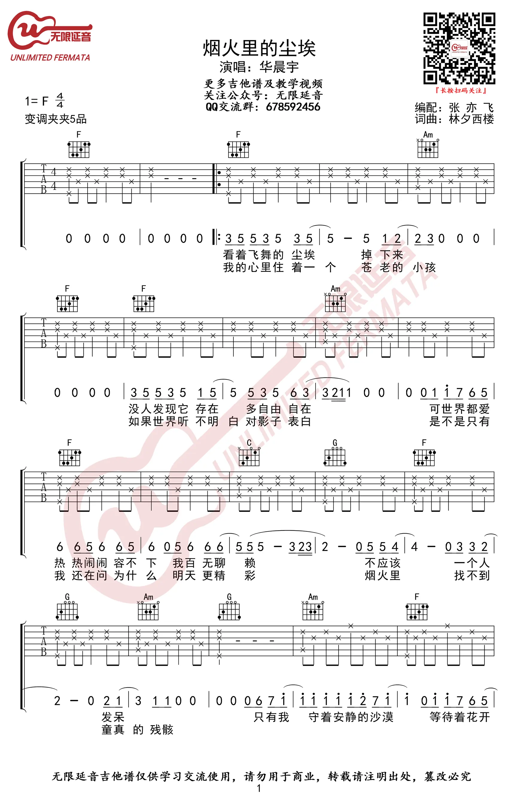 《烟火里的尘埃》吉他谱,华晨宇演唱,林夕作词,西楼作曲,2014年发行,收录于专辑《卡西莫多的礼物》中,获2015年音乐风云榜十大金曲奖。吉他谱完整版共5张高清图片谱,由无限延音编配出品。