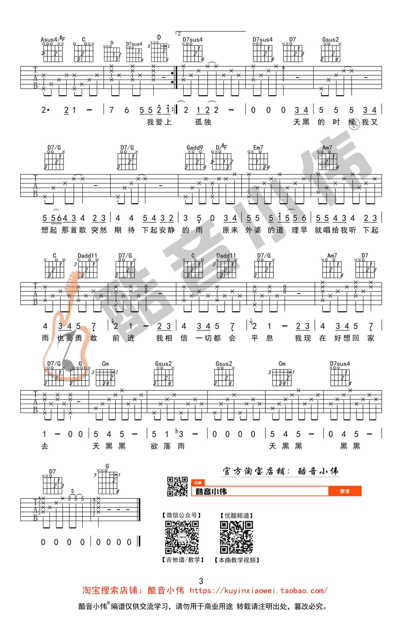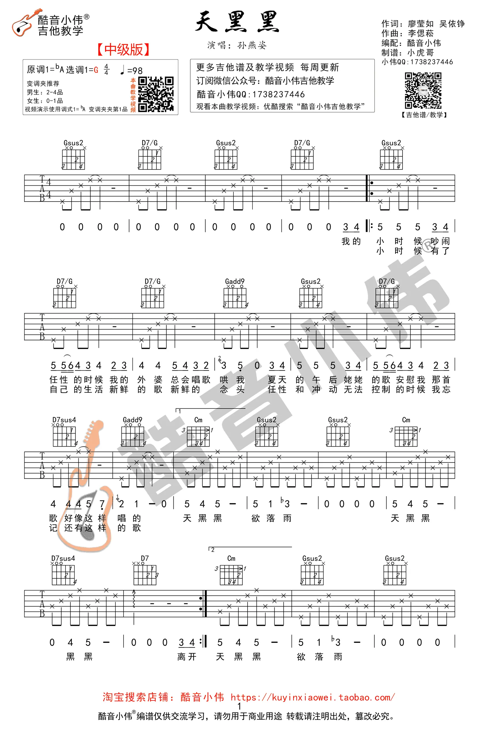 《天黑黑》吉他谱_孙燕姿_G调_弹唱谱_高清图片谱