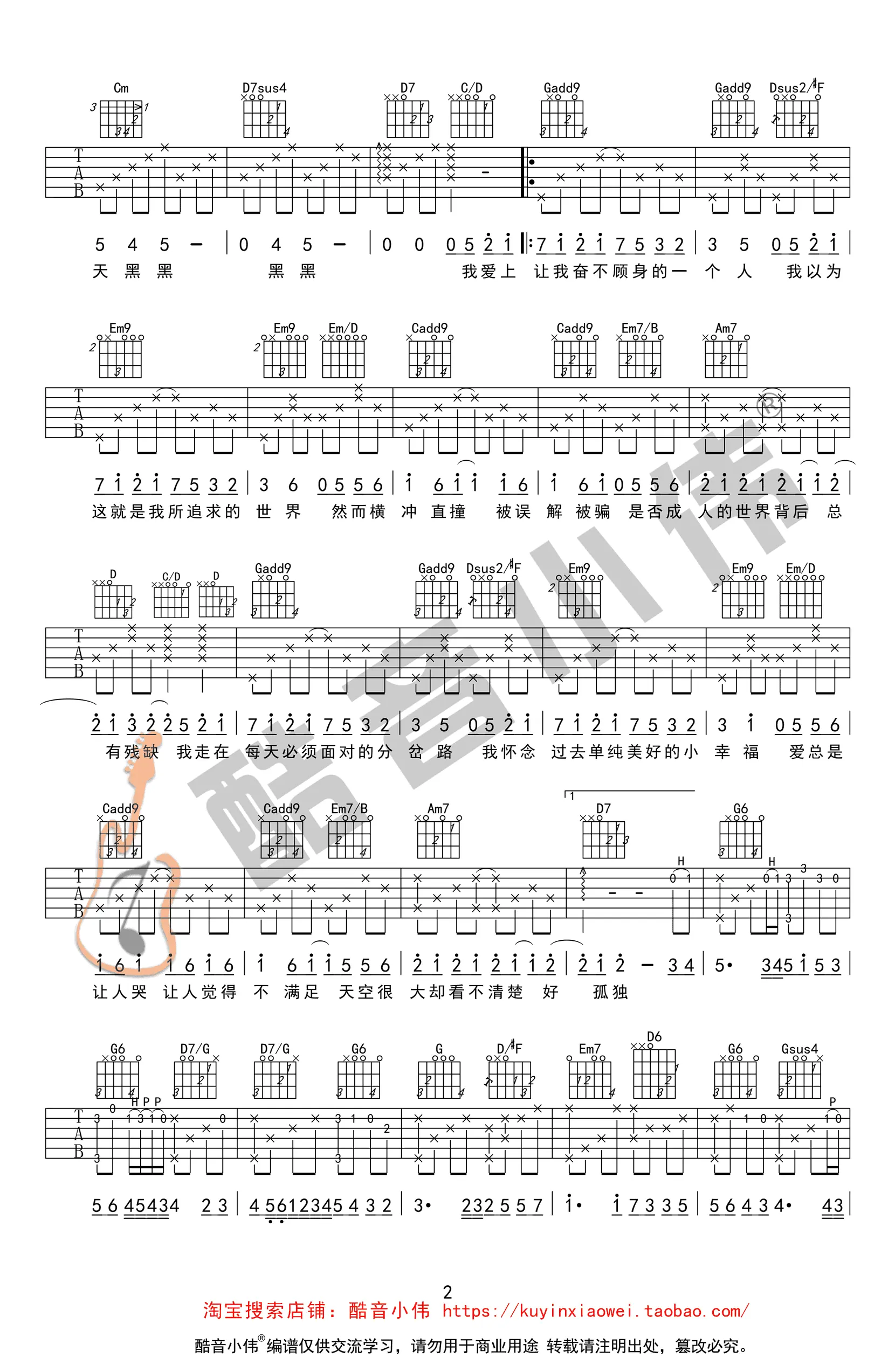 《天黑黑》吉他谱,孙燕姿演唱,廖莹如、吴依铮作词,李偲菘作曲,2000年发行,收录于专辑《孙燕姿》中。歌曲原调降B,吉他谱选调G调,男生capo夹2-4品,女生capo夹0-1品,共3张高清图片谱,由小伟老师编配出品。