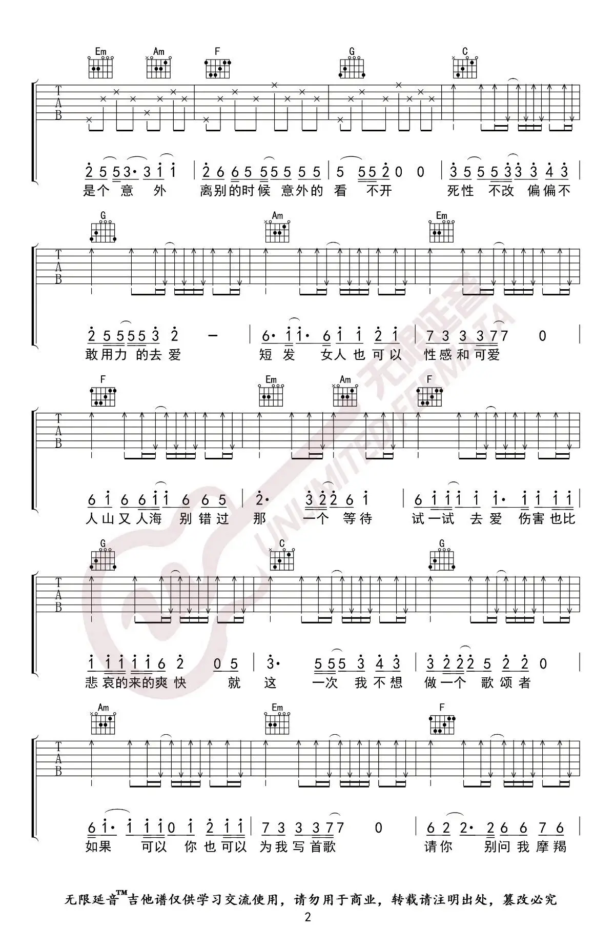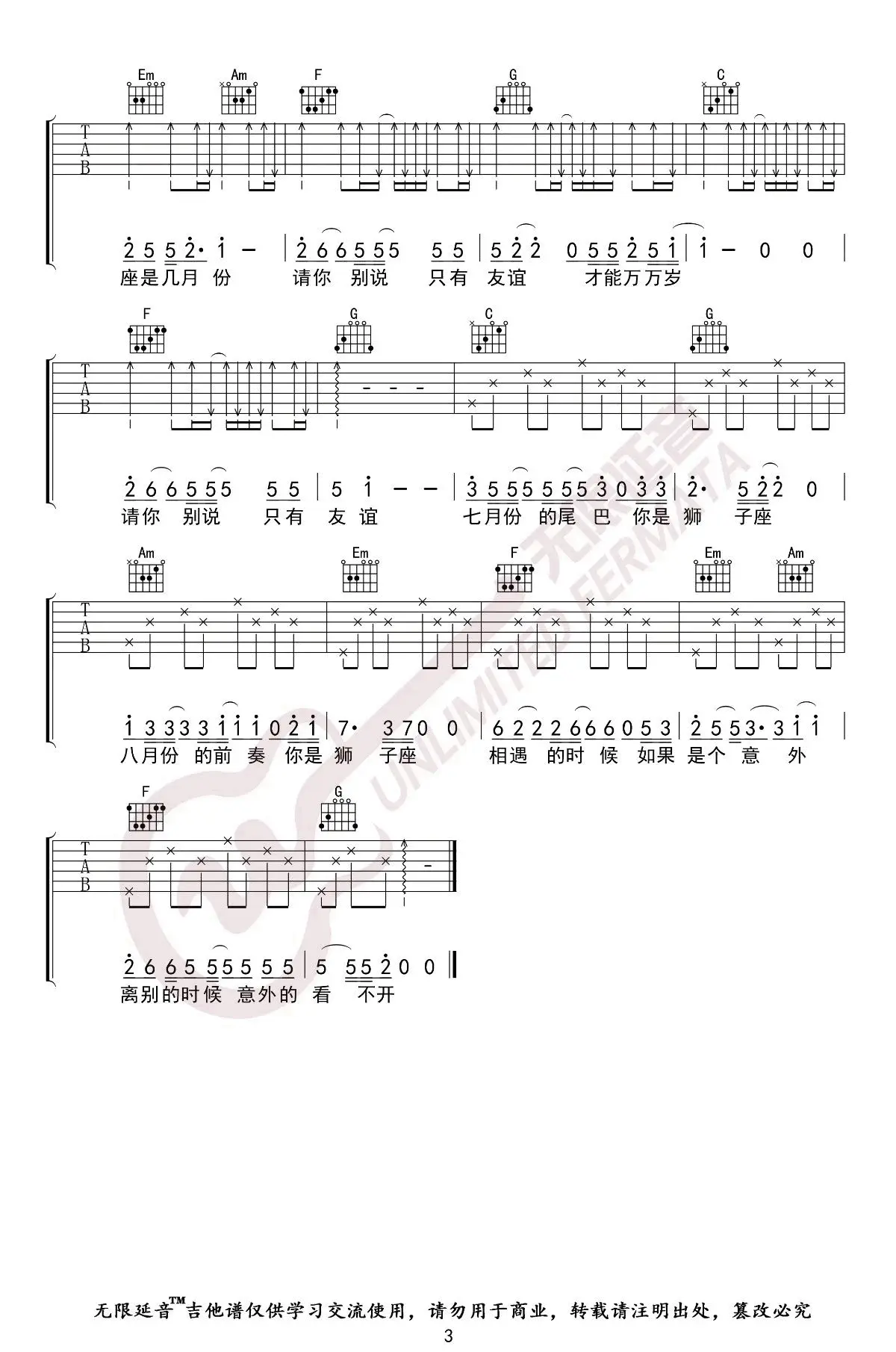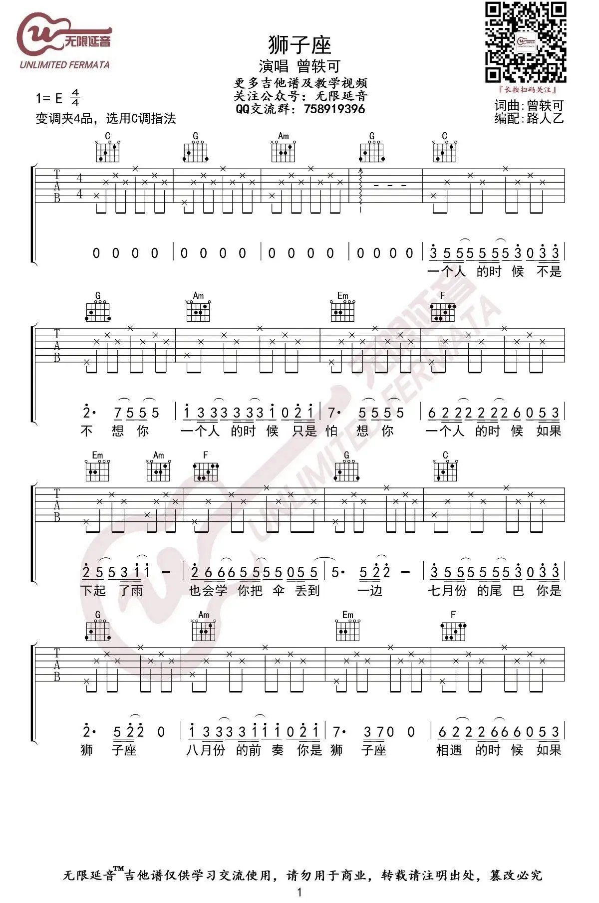 《狮子座》吉他谱,曾轶可作词作曲及演唱的歌曲,2009年发行,收录于专辑《Forever Road》中。歌曲原调E,吉他谱选用C调指法编配,capo夹4品为原调,共3张图片谱,由无限延音编配出品。